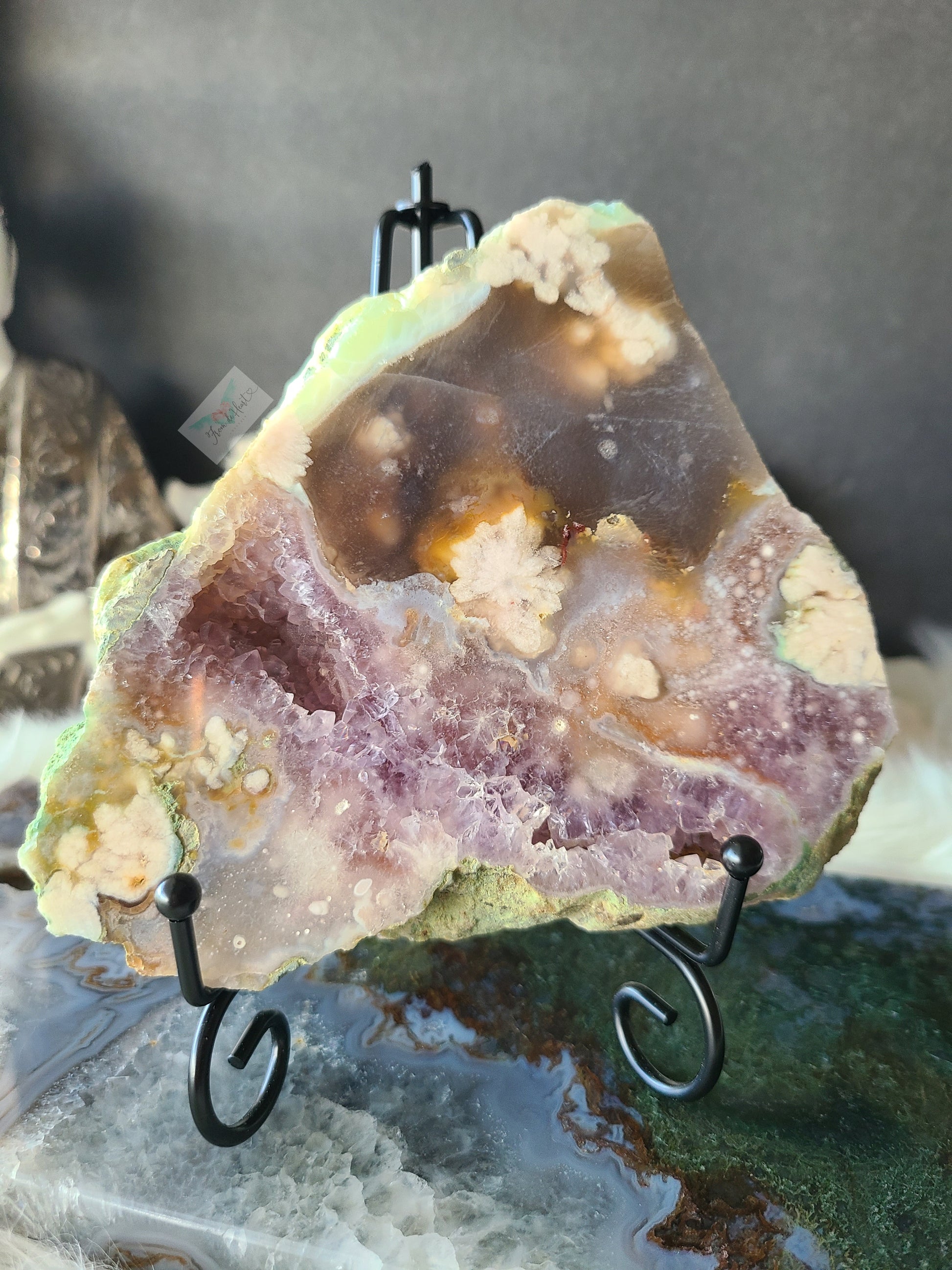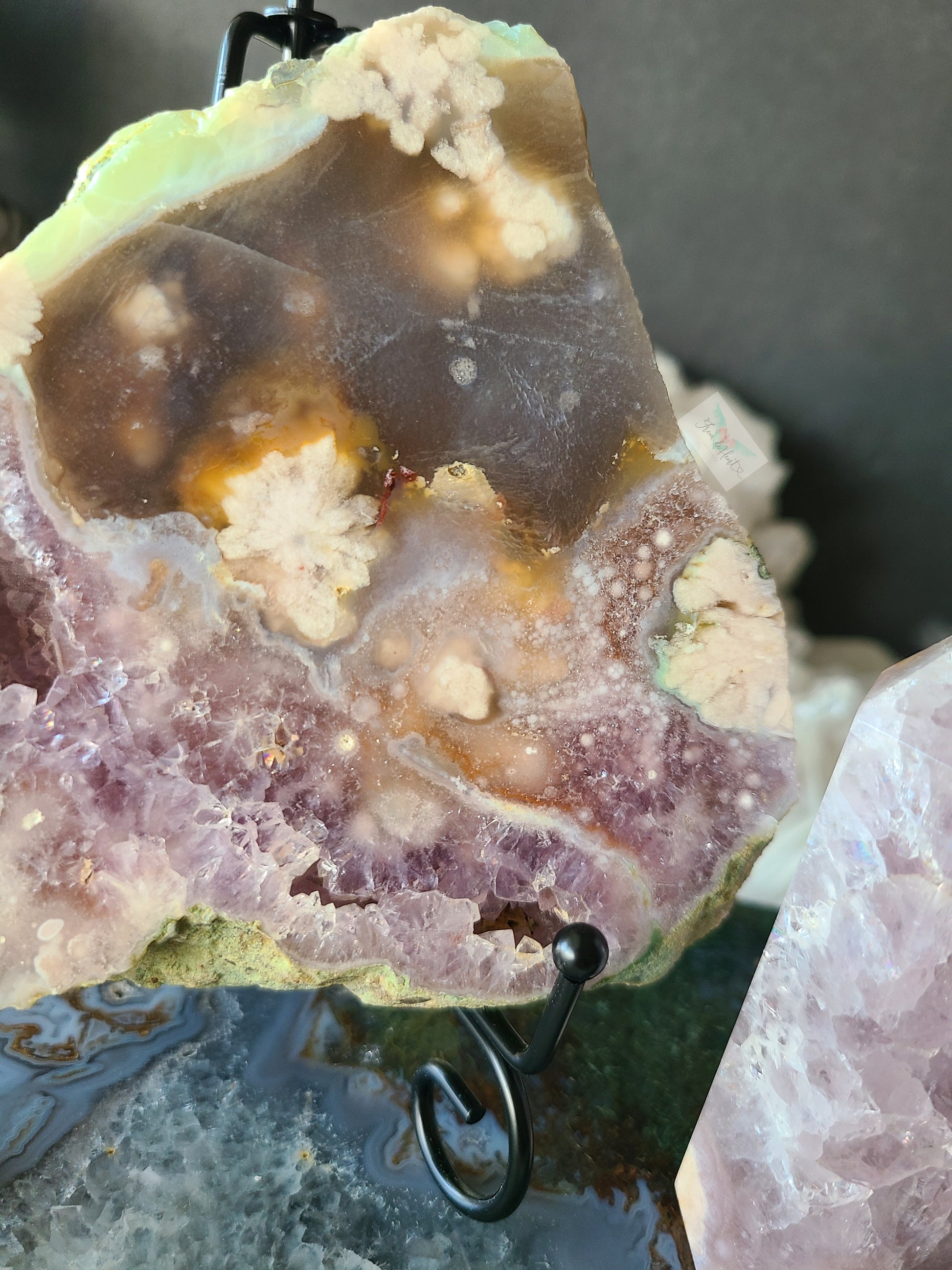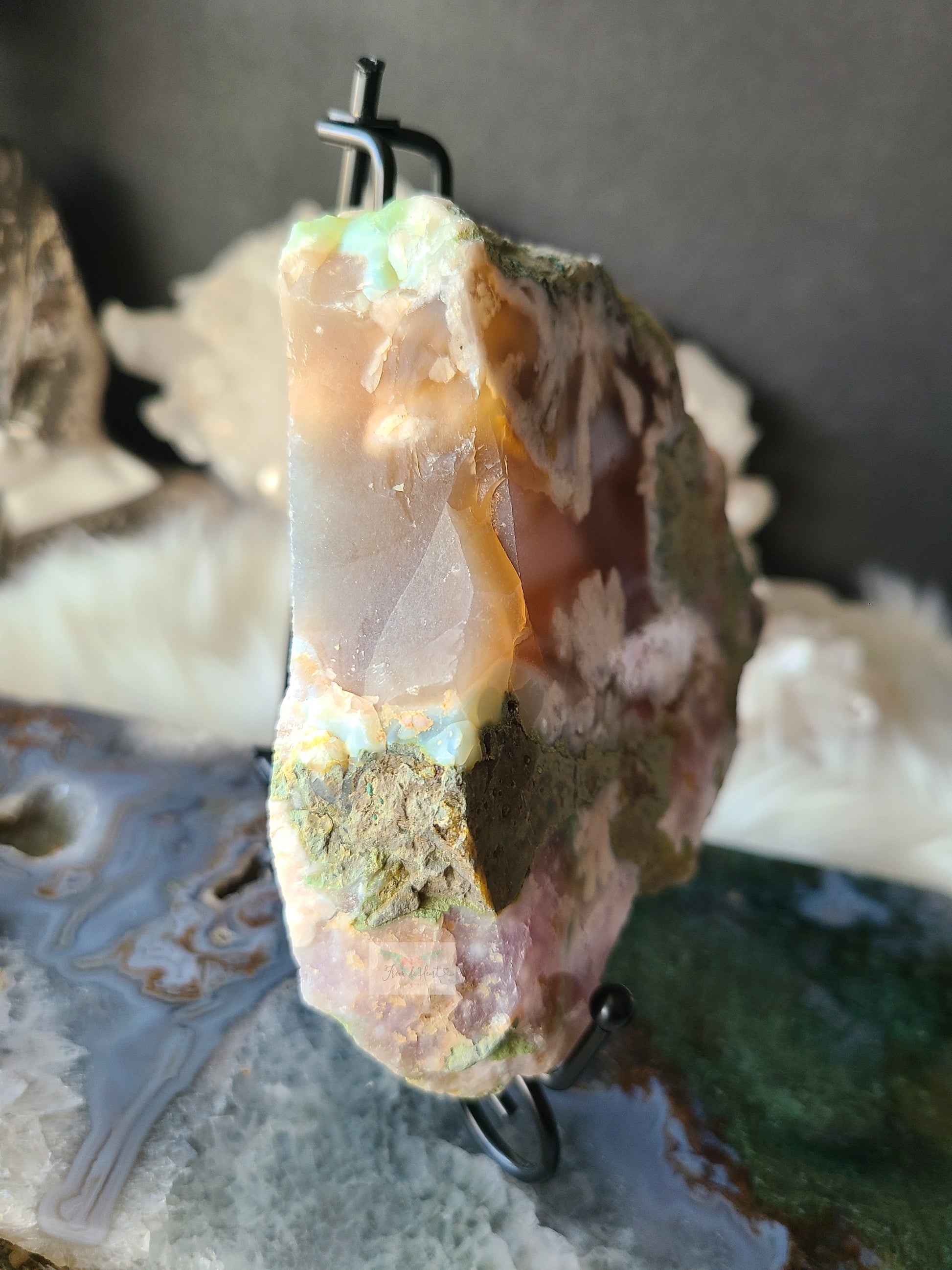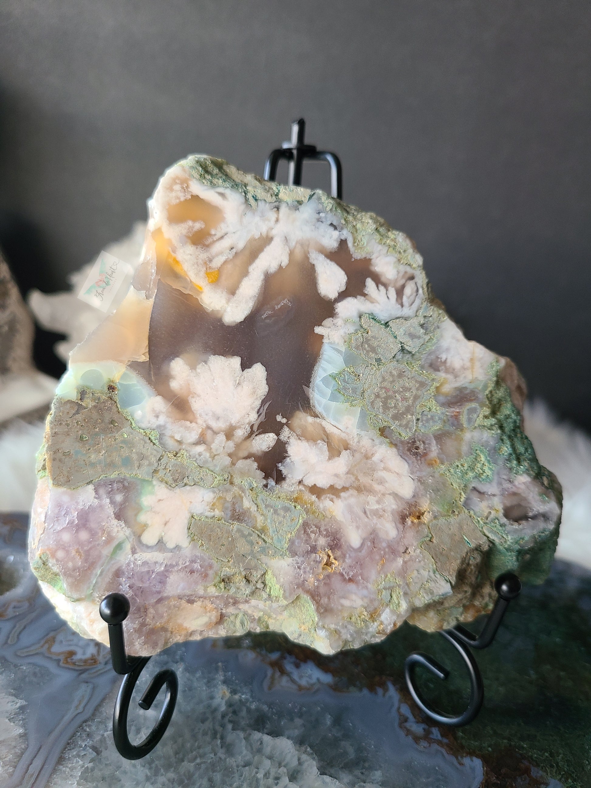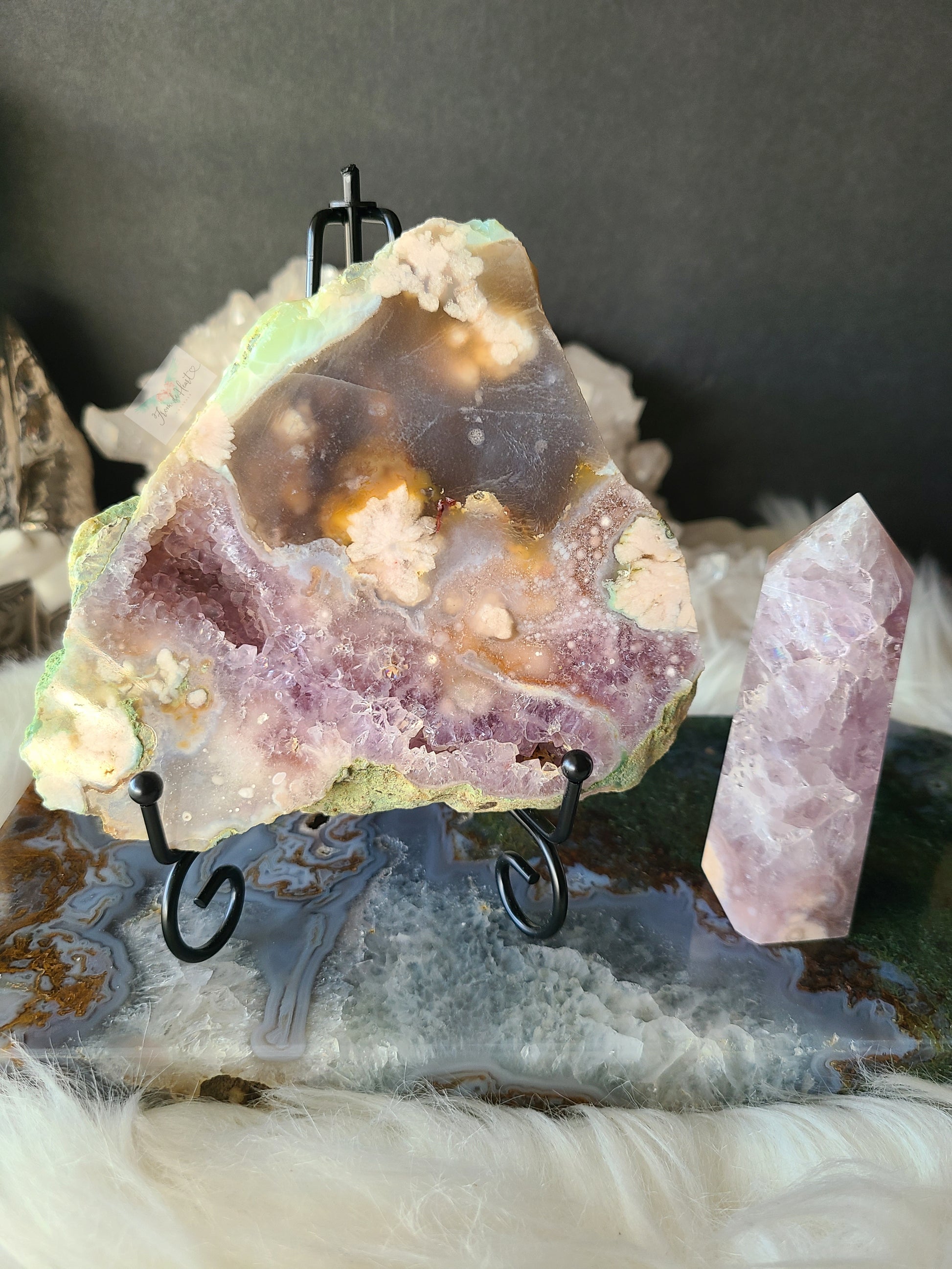 This listing is for (1) Amethyst Flower Agate point and green Flower Agate slab. You will receive a total of two item: slab and tower.
