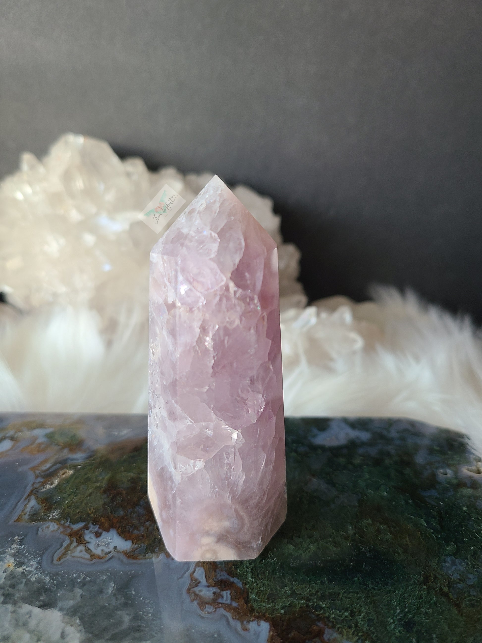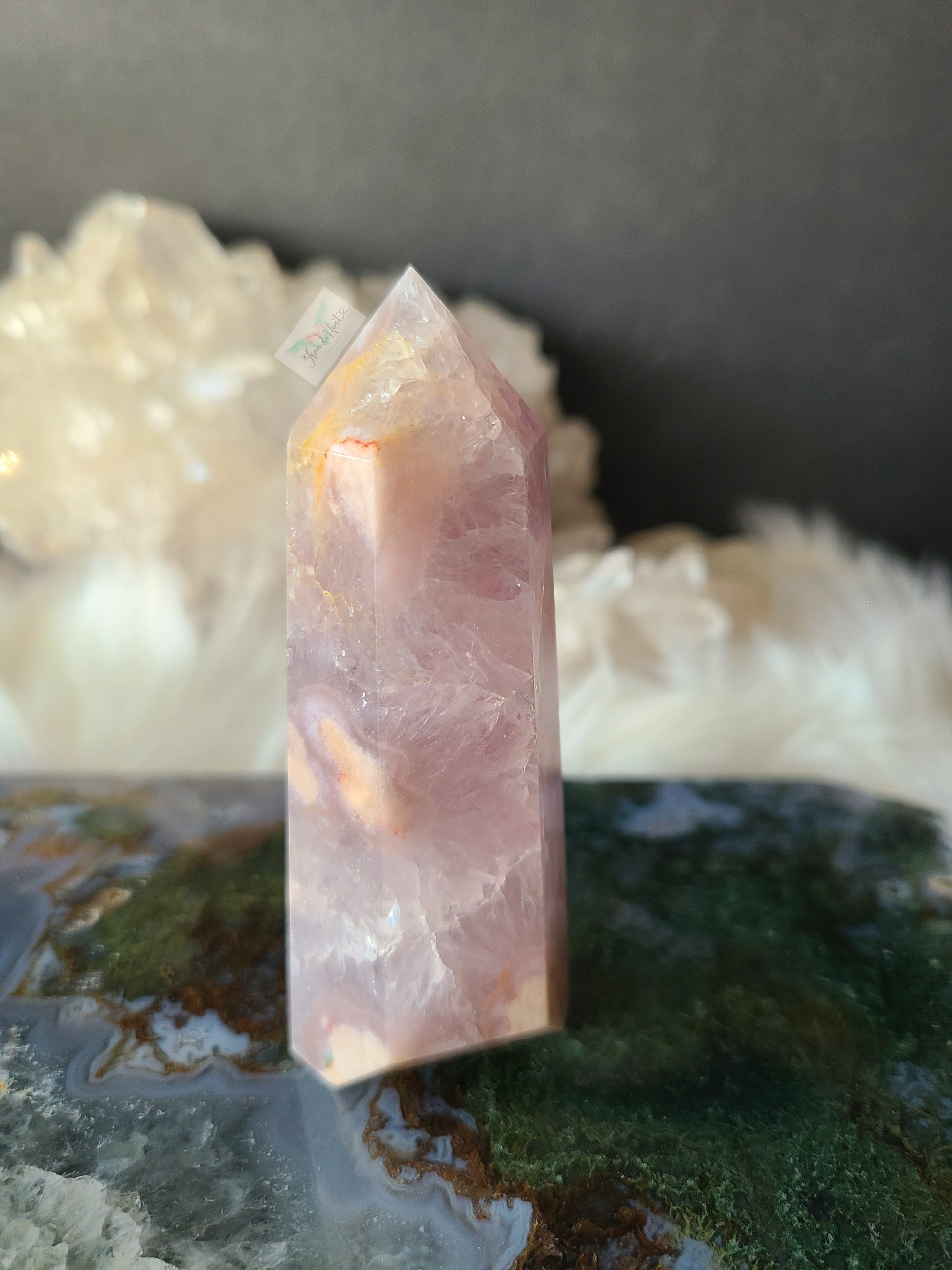 Tower is light purple Amethyst with a hint of Flower Agate on the back. Tower has rainbows.