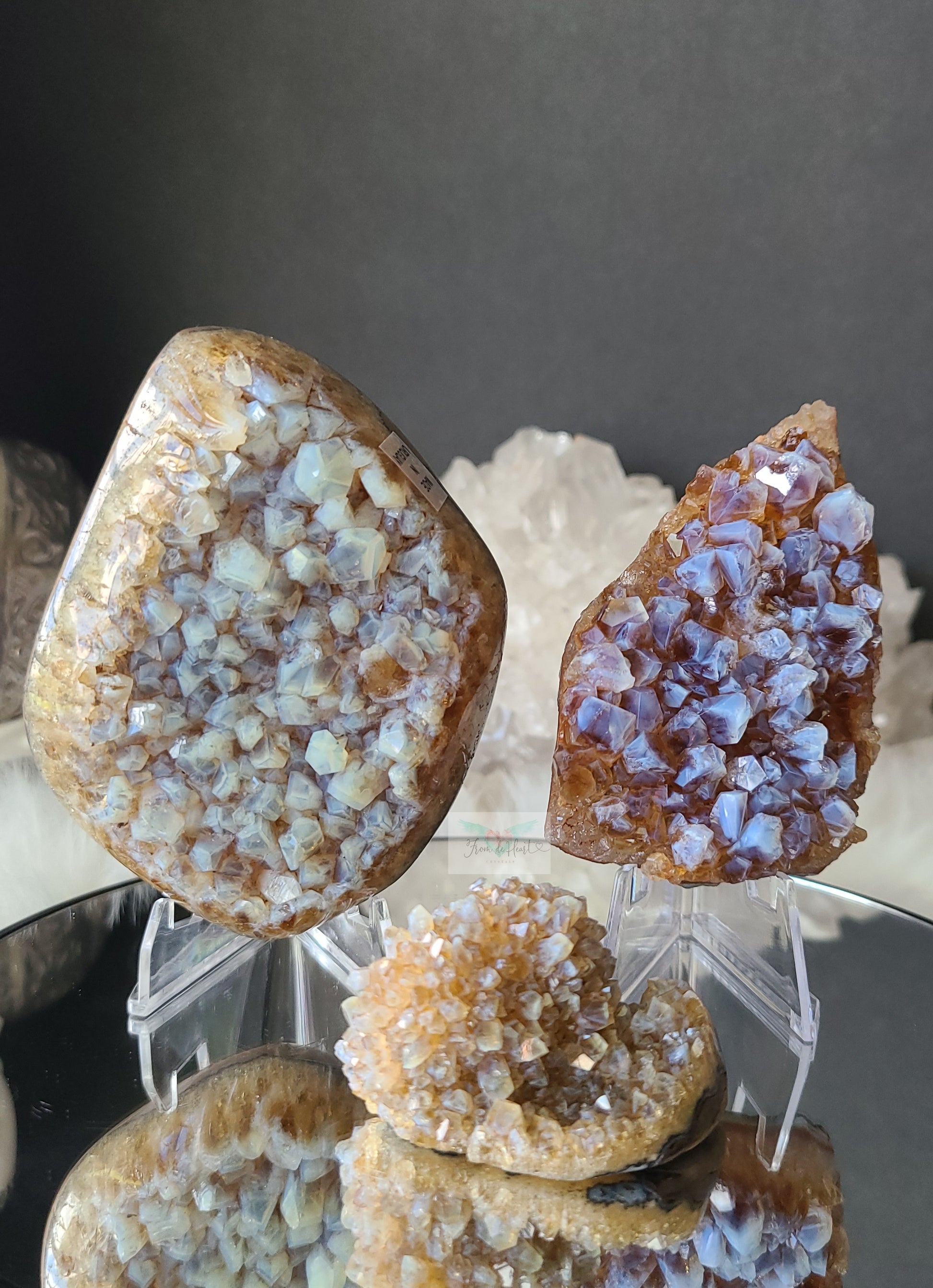 These clusters are heat treated Amethyst "citrine" (which gives them their golden color), coated in blue chalcedony.