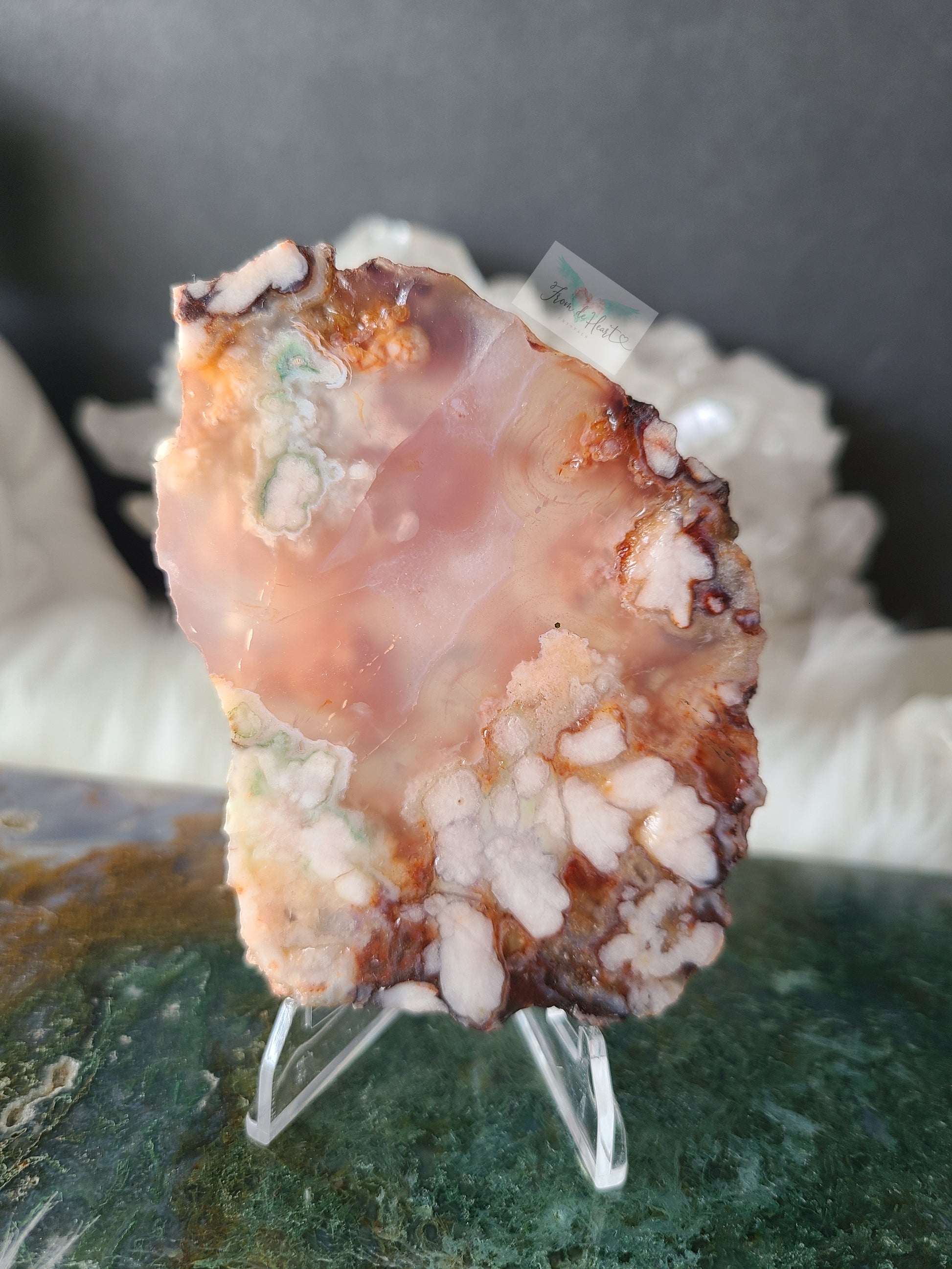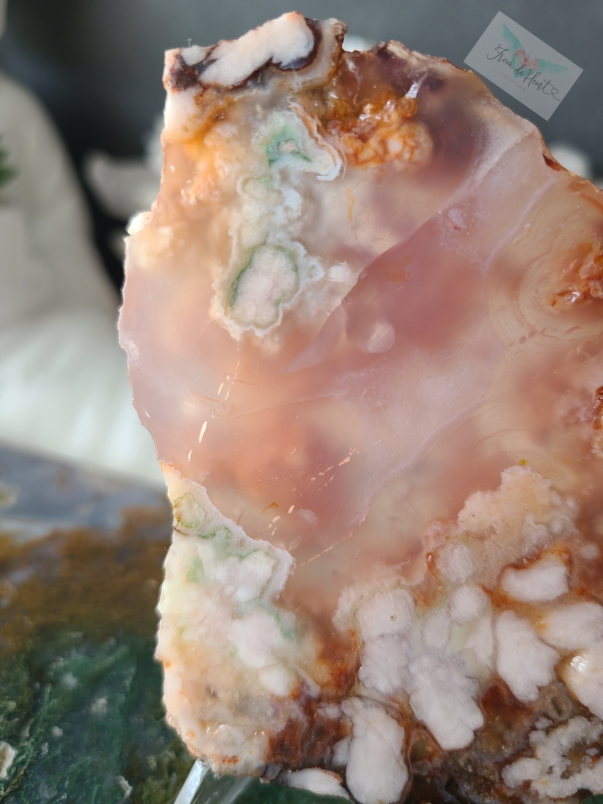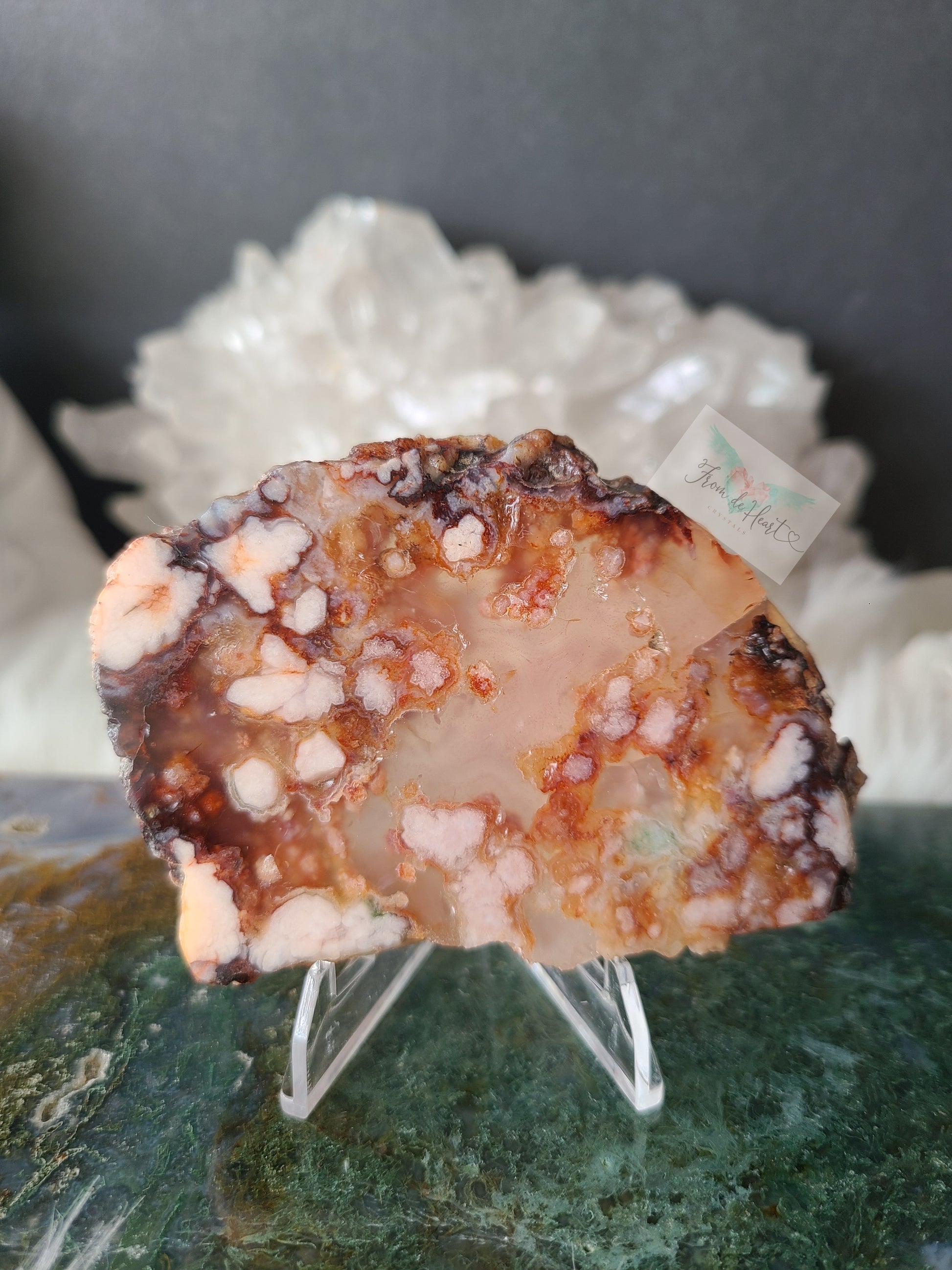 This listing is for (1) Carnelian Flower Agate slab. This slab has a pink and green flowers. The pop of green is wonderful contrast. This slab is polished front and back with uneven and unpolished edges.