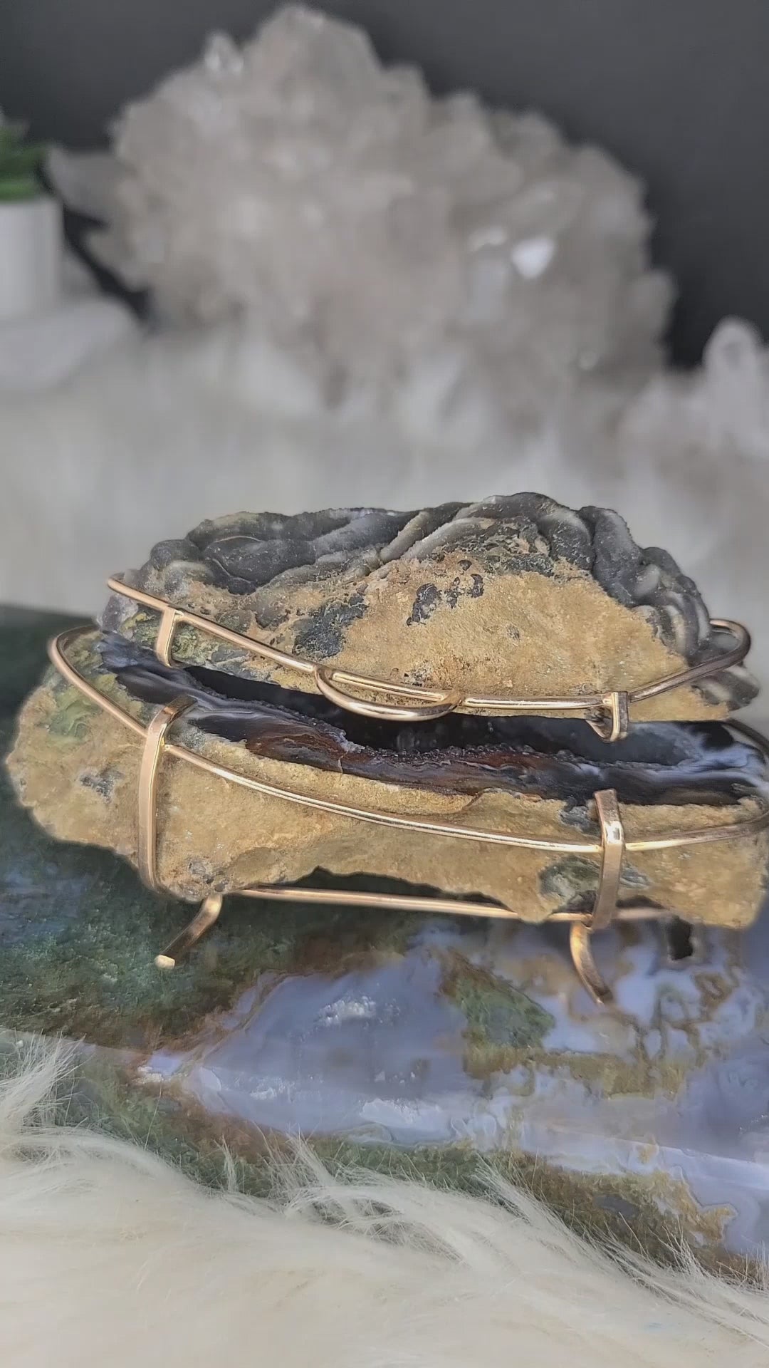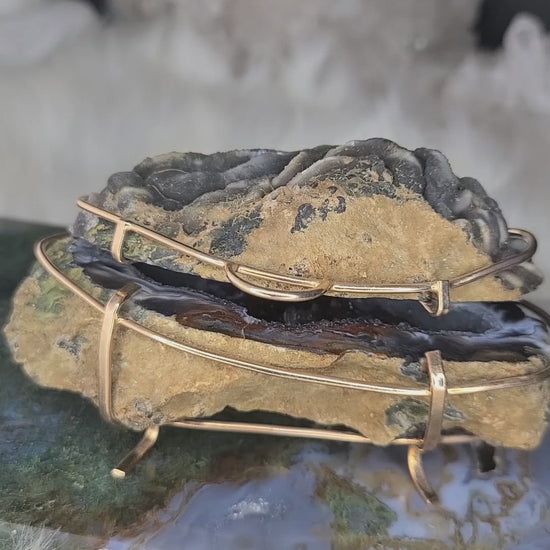 This one-of-a-kind Chalcedony Agate Jewelry Box features striking dark red and blue-gray tones with natural Quartz inclusions. Hand-crafted from a sliced agate geode, it showcases semi-polished surfaces, authentic vugs, and asymmetrical edges that highlight its natural character. The protective metal cage adds elegance without real gold plating. Ideal as a thoughtful gift or a stunning vanity accent.