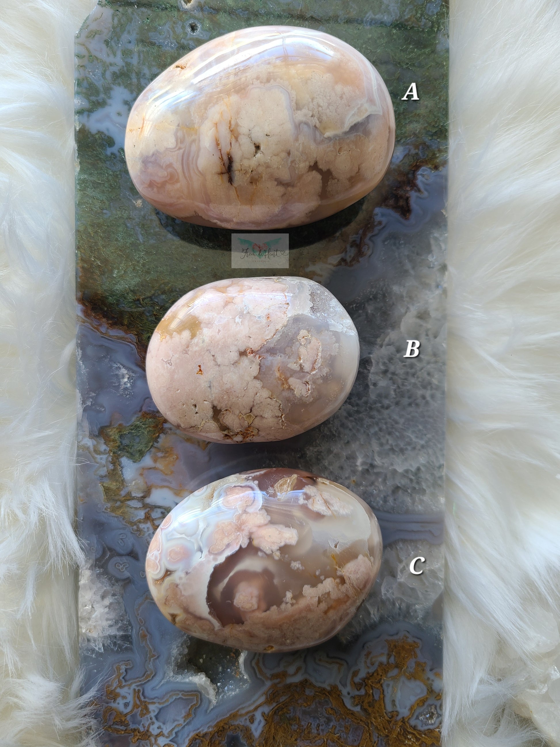 This listing is for (1) Flower Agate palm stone. This palm stone has druzy with golden agate and defined flowers