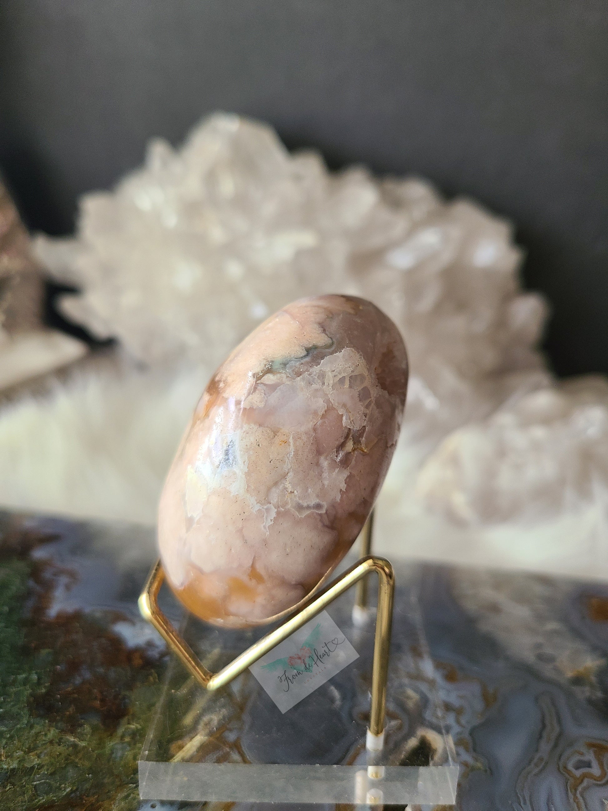 The Flower Agate Palm Stone is a nurturing crystal that inspires motivation and encourages one to pursue their goals. With its calming energy and unique flower patterns, this stone is the perfect addition to any crystal collection. Let the Flower Agate guide you towards a brighter future.