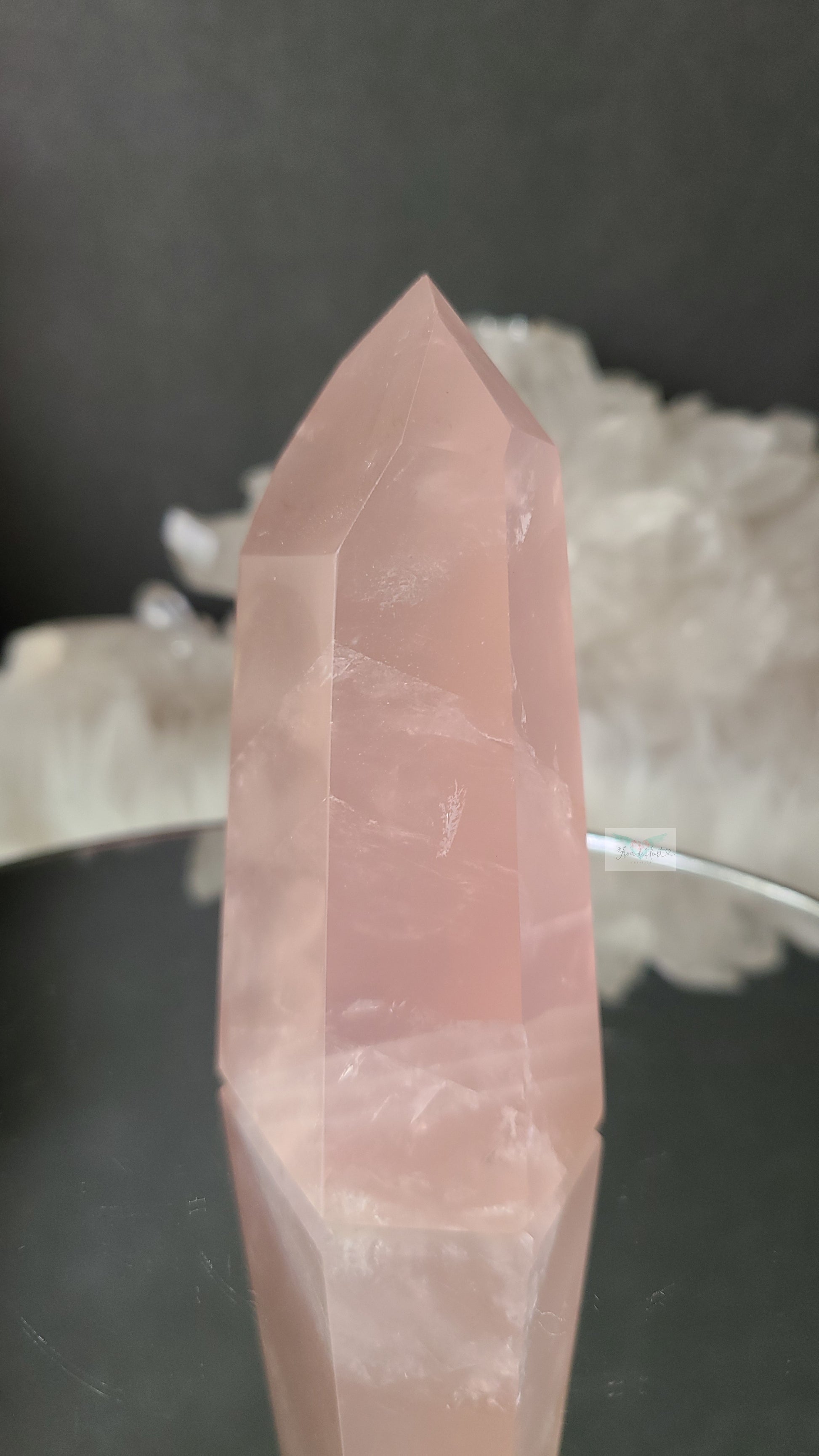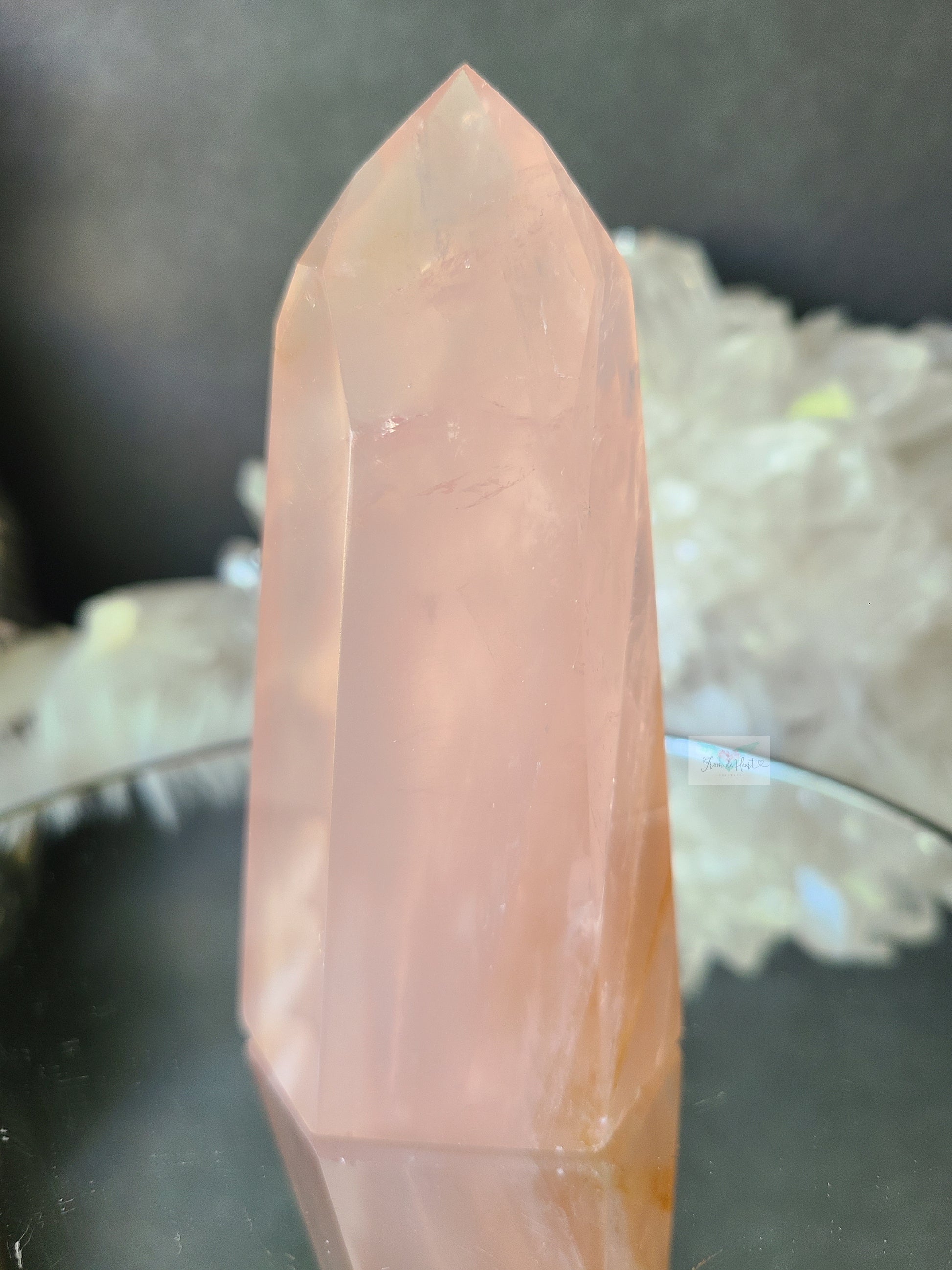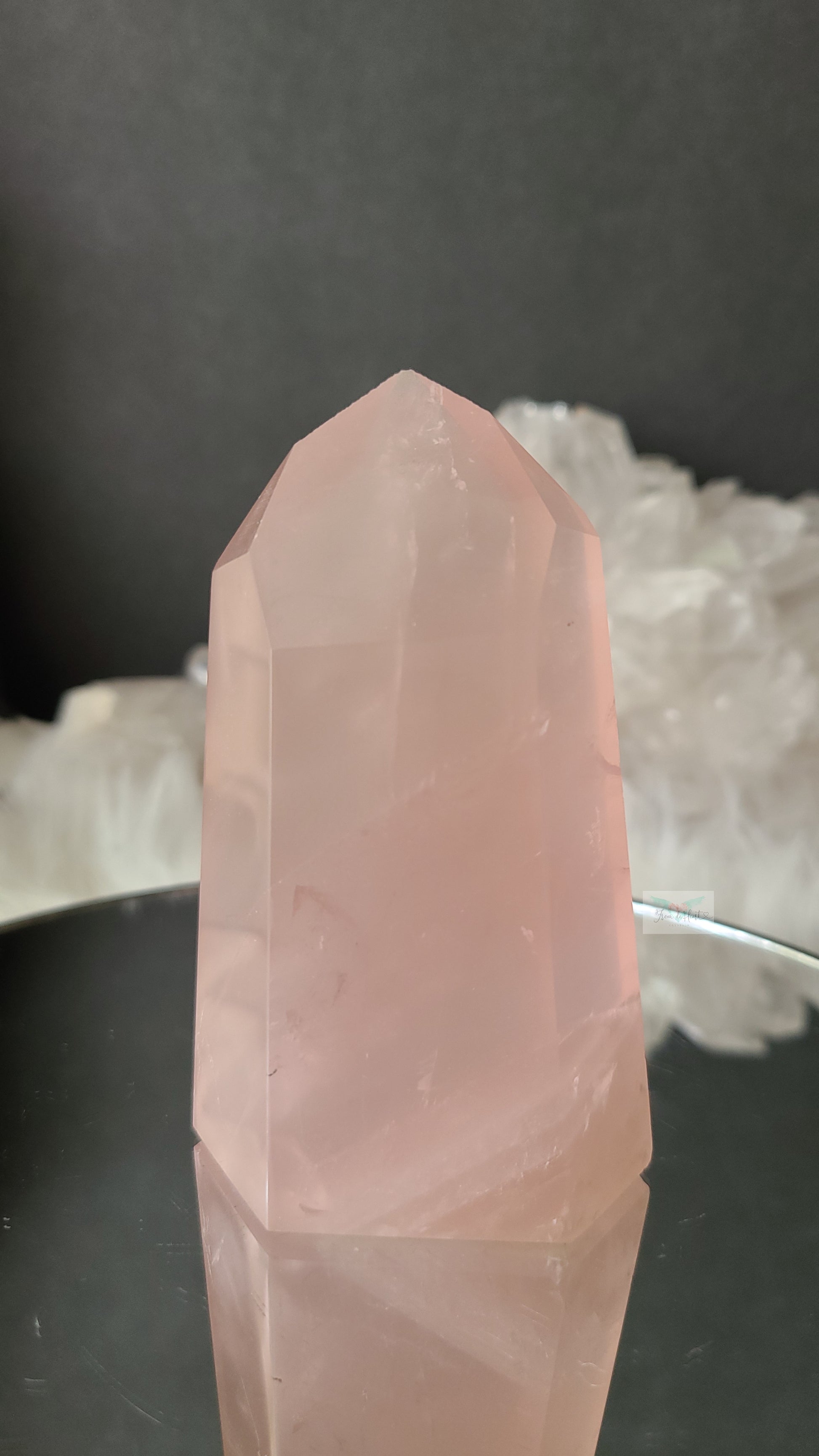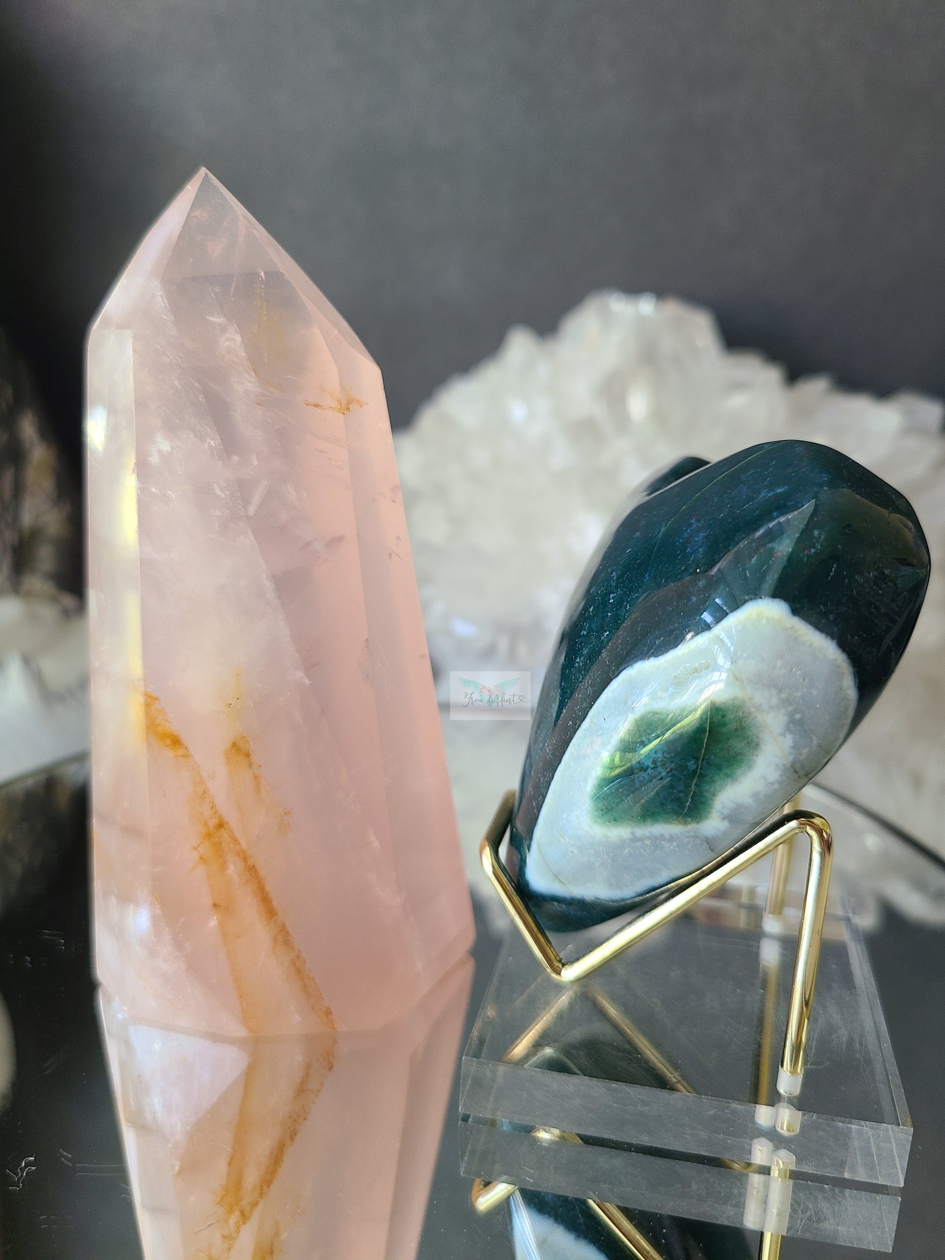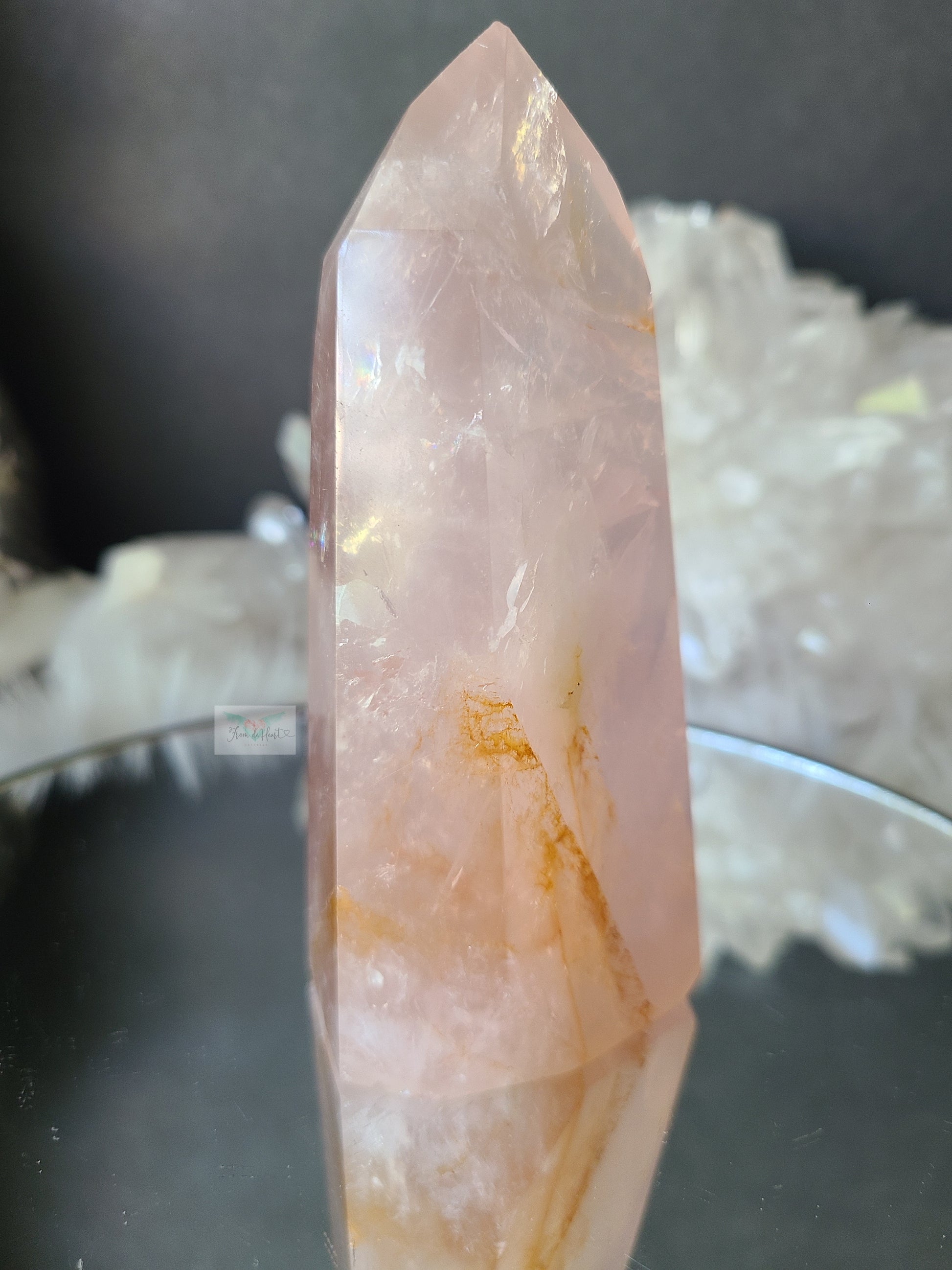 Bundle Two: Heart has a white ring of quartz. Rose quartz tower has rainbows and iron inclusions.