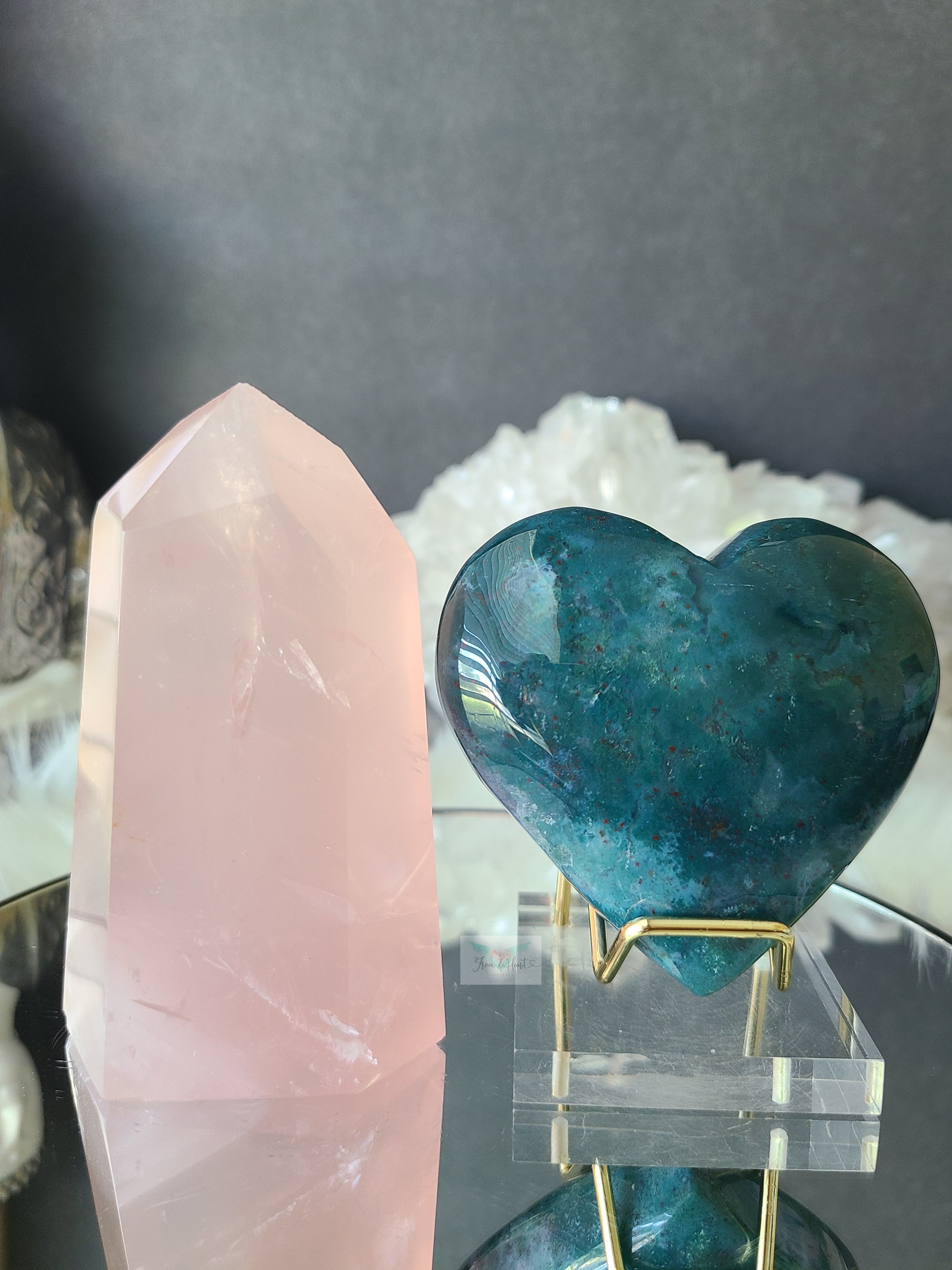 This listing is for (1) "Rose Quartz Bundle". In this bundle you will receive one Rose Quartz tower and one Moss Agate heart carving. Two bundles are available.