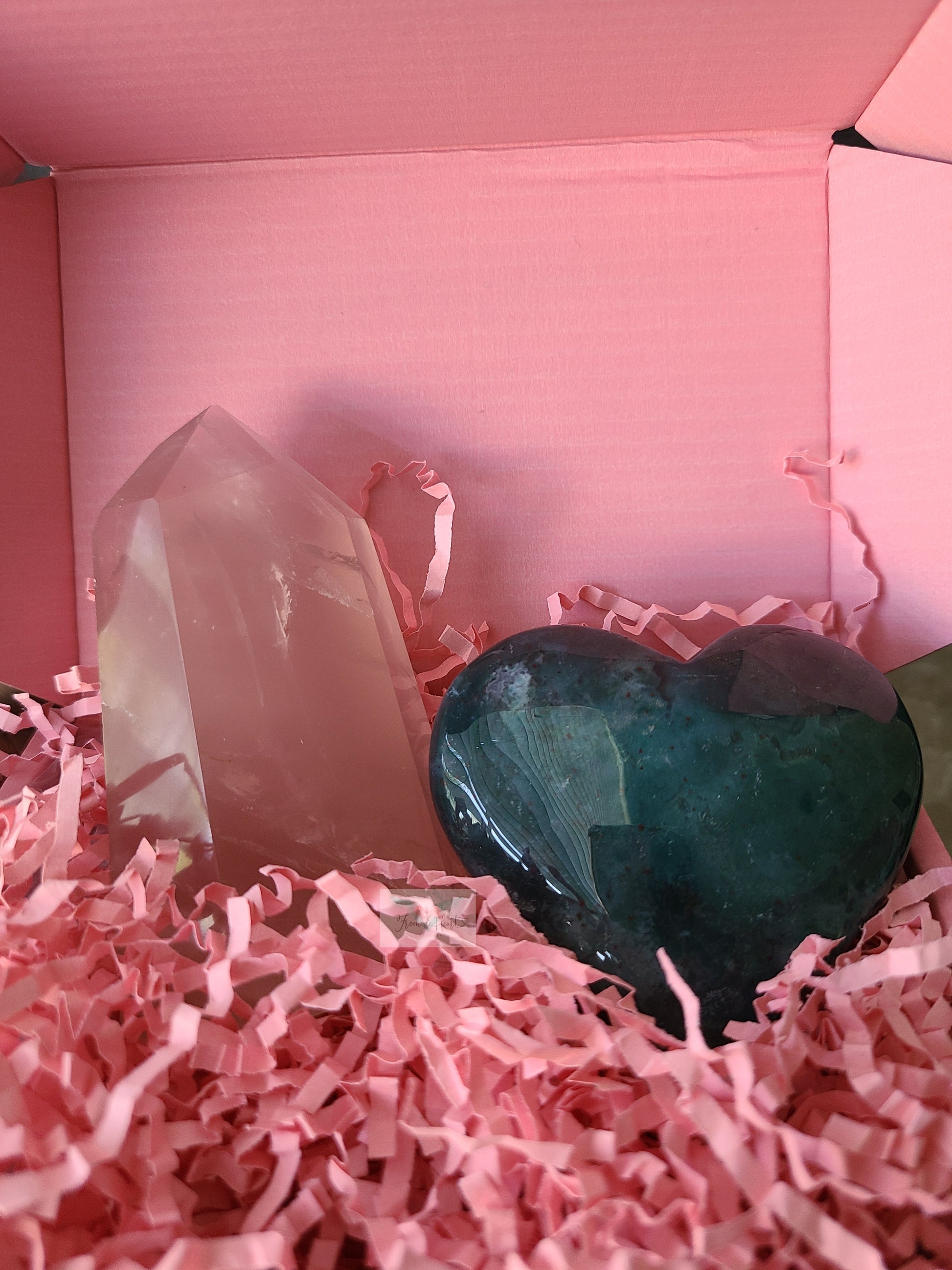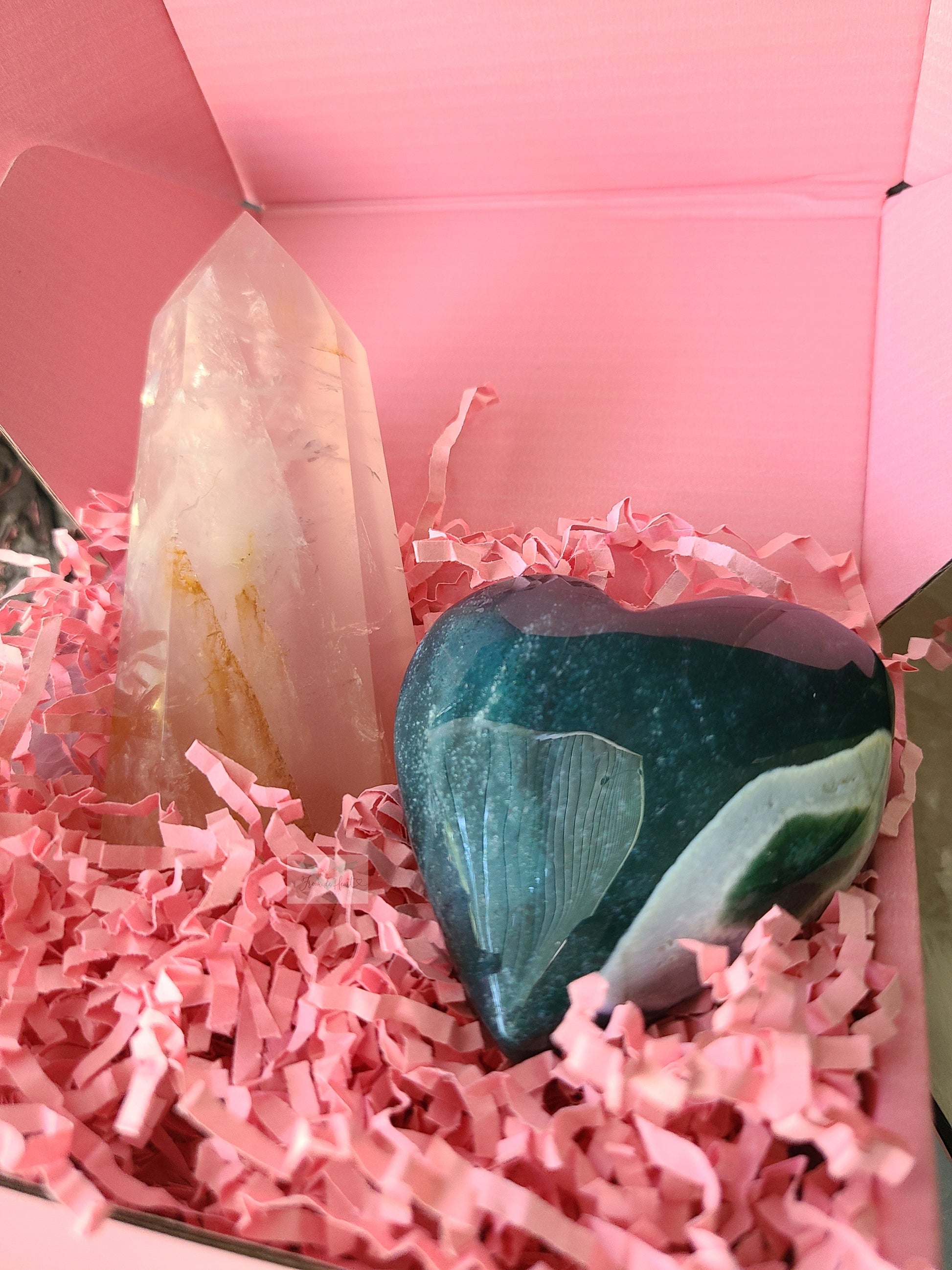 Bundle One: Heart is a gorgeous green with red inclusions. Rose quartz tower has rainbows.
