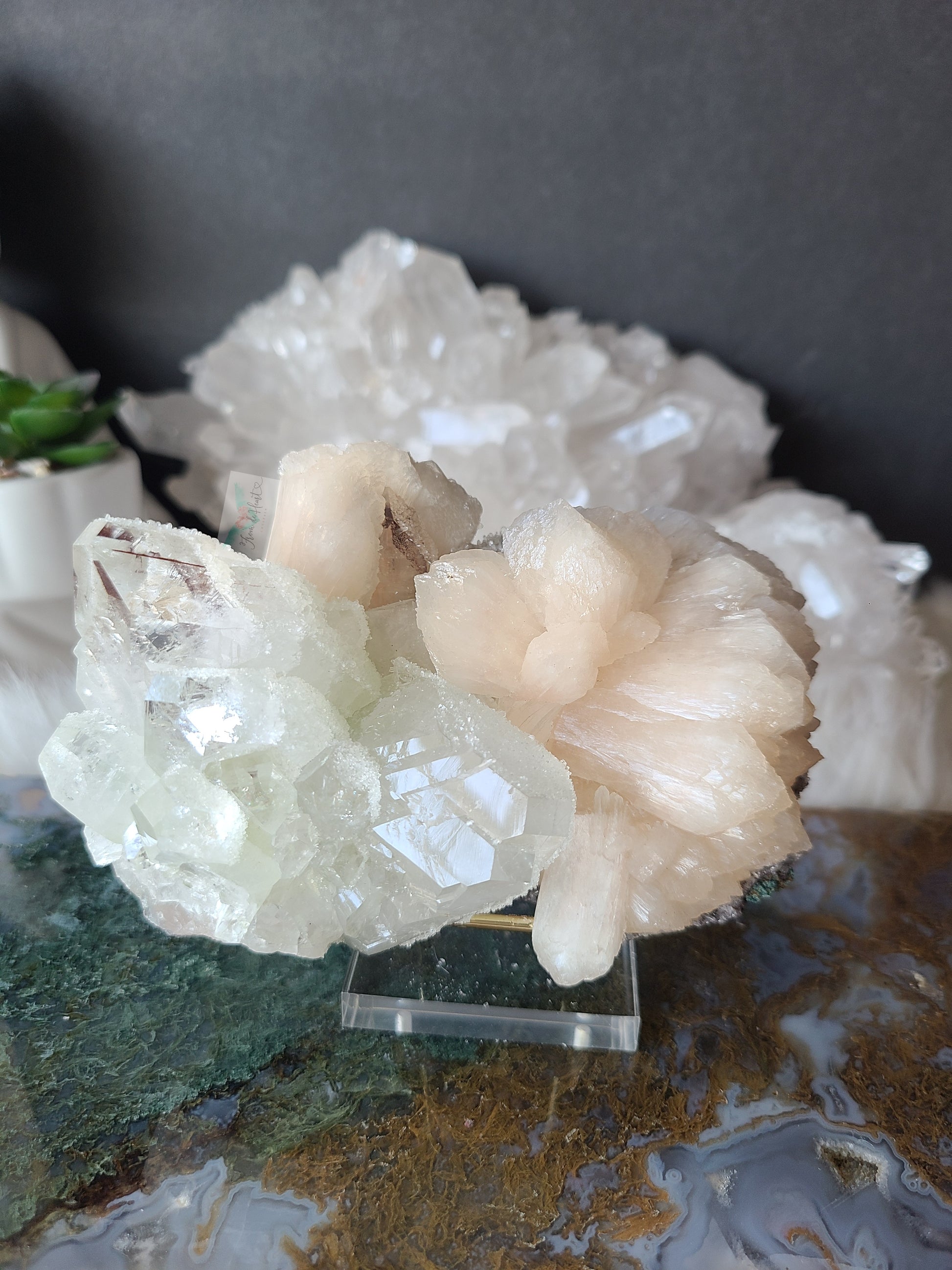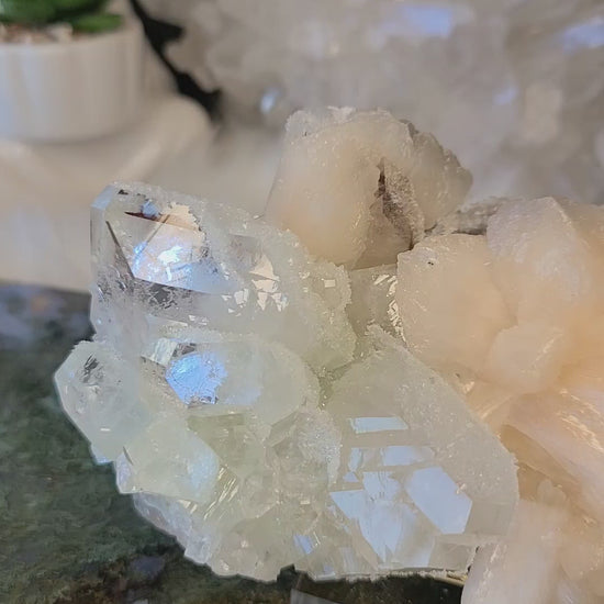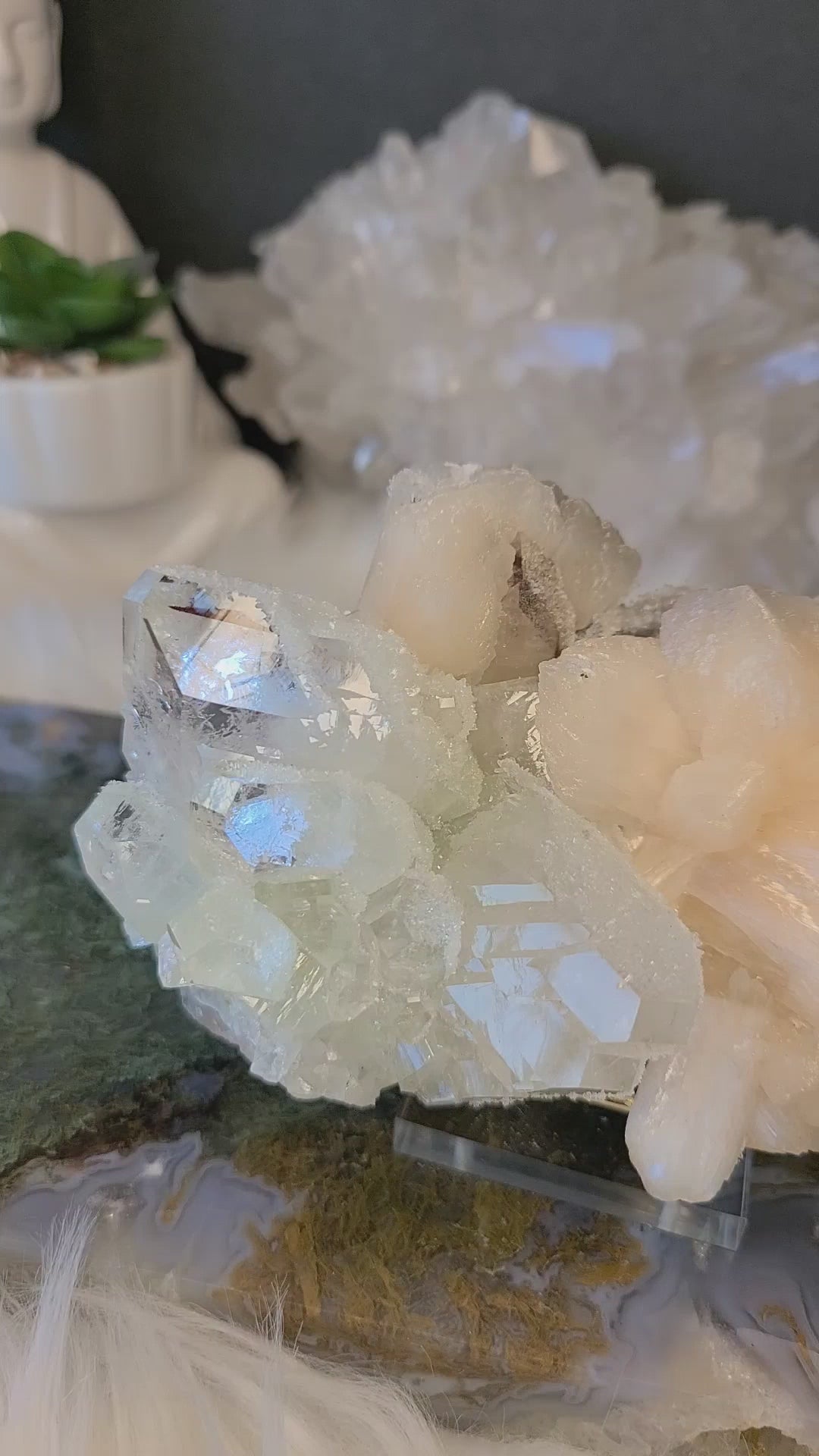 This listing is for (1) high quality sugar Indian Zeolite specimen. This stunning zeolite treasure pairs delicate water-clear Apophyllite points with peachy-gray Stilbite formations, all dusted in that coveted sugary sparkle collectors dream about. Tipping the scales at over a pound, this beauty is a serious addition to any mineral collection. Perfect for those who appreciate the finer things in the crystal world—rare, high-quality, and absolutely show-stopping.