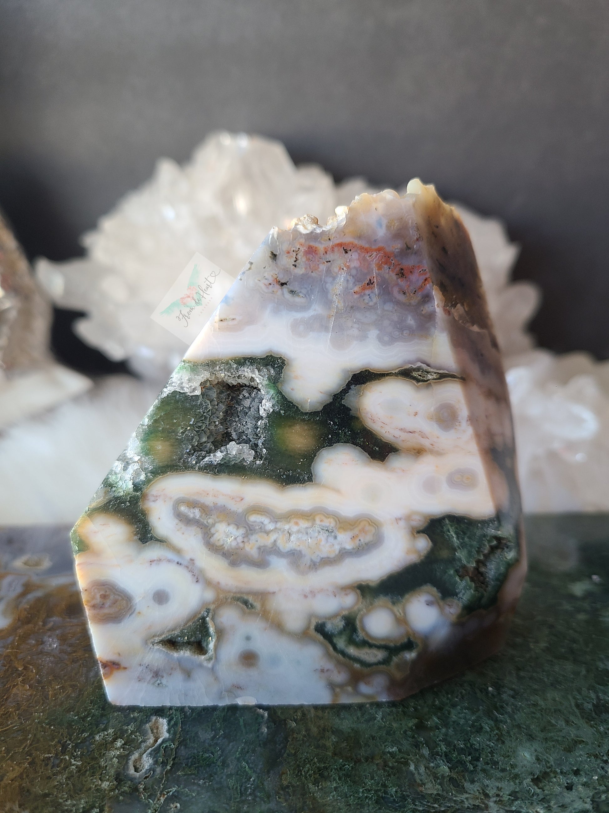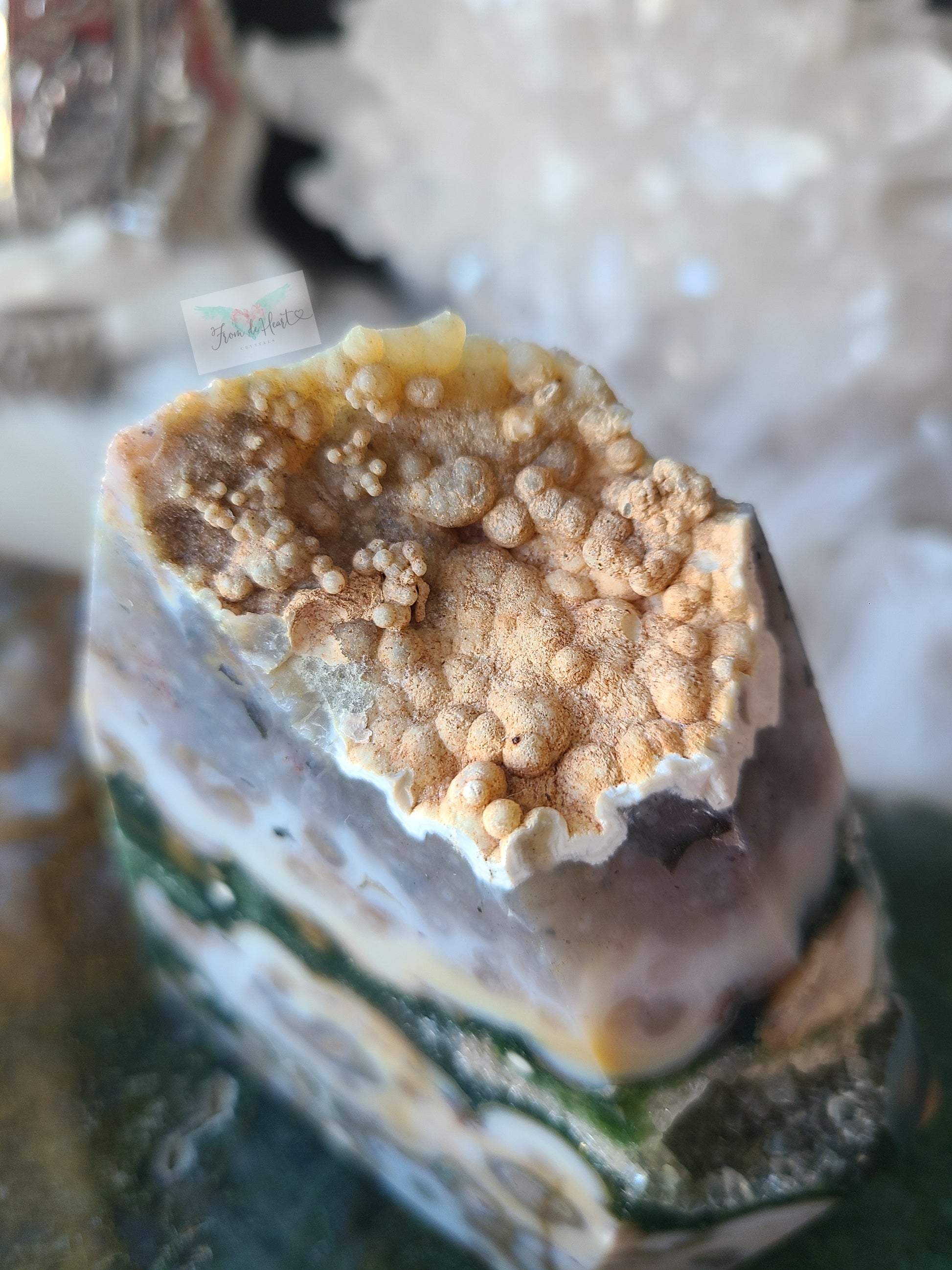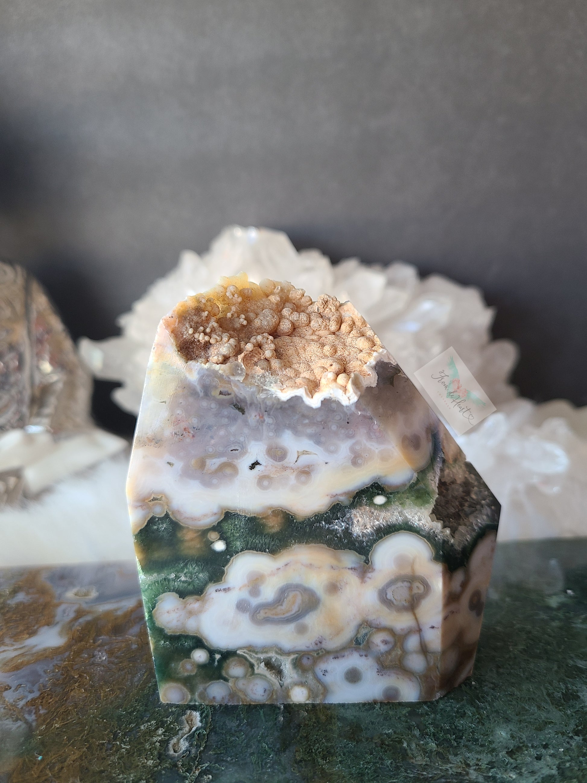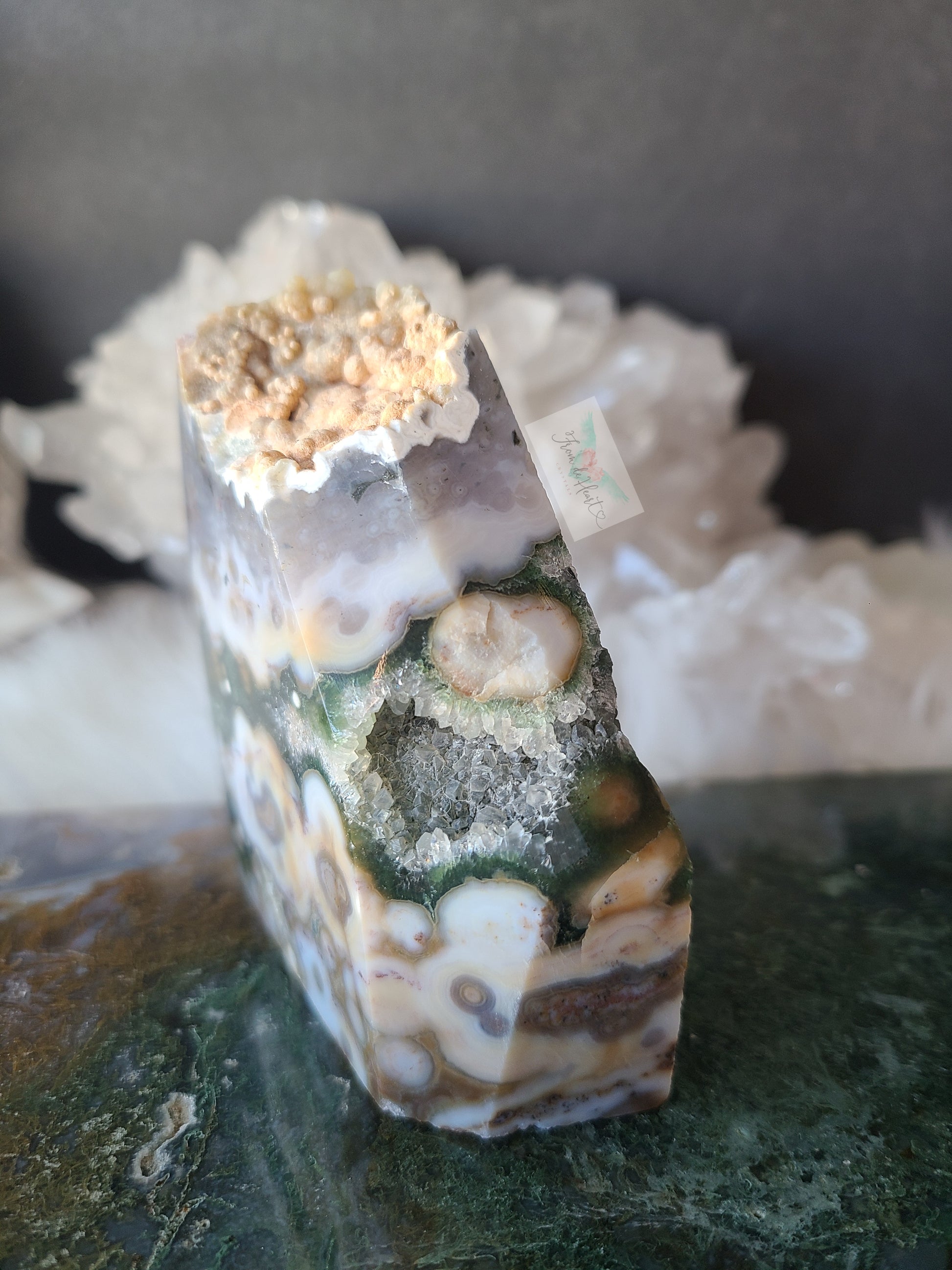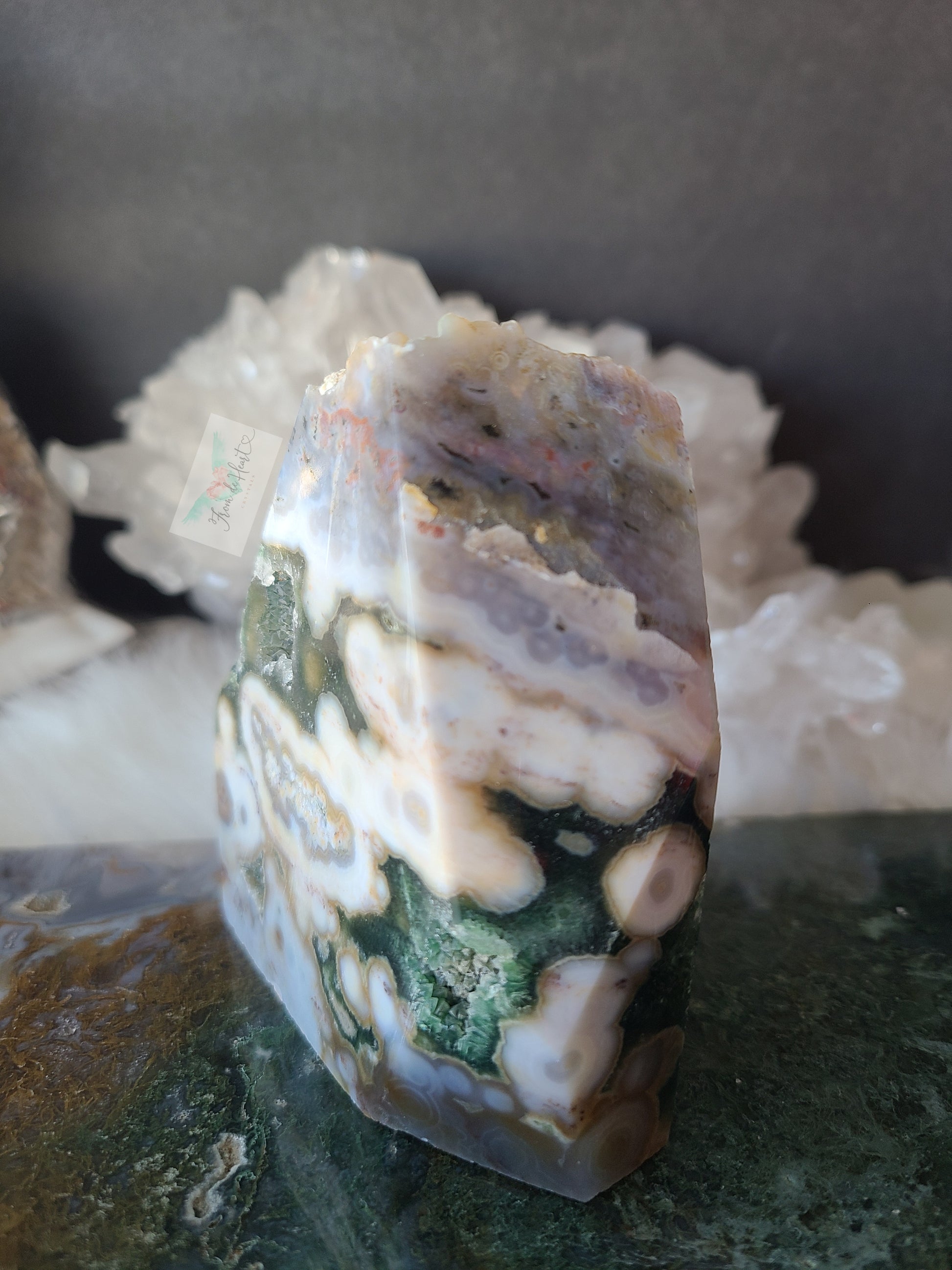 This listing is for (1) Ocean Jasper free form. This orbicular Ocean Jasper free form has Quartz druzy and a botryoidal (bubbly) top. Quartz has rainbows. It weighs almost 1 lb.