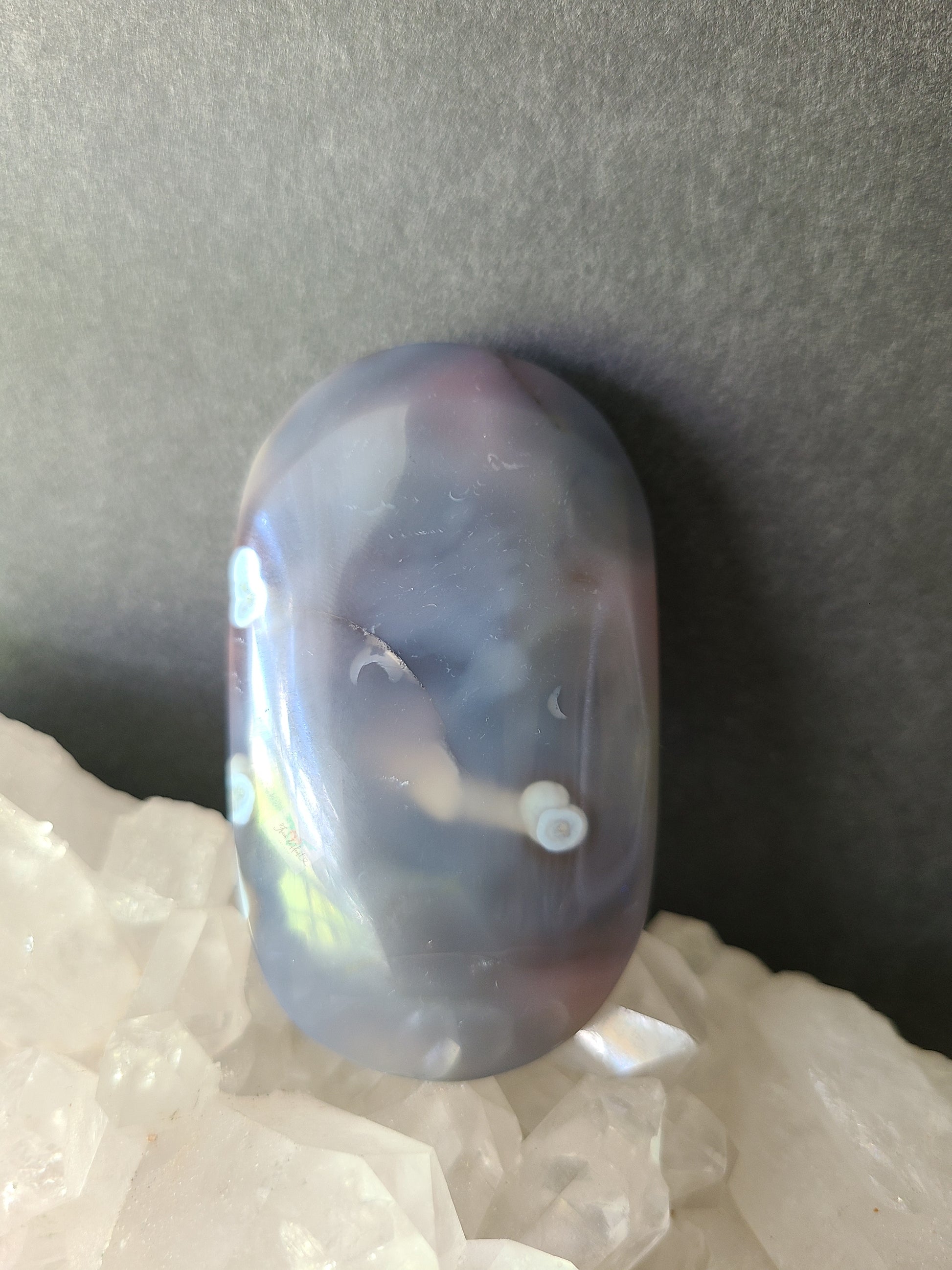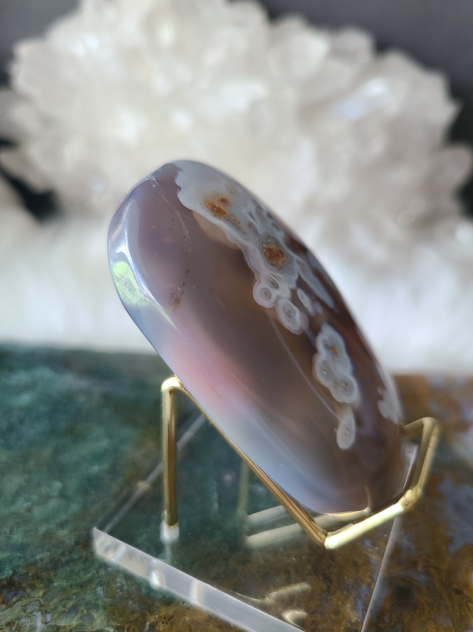 This listing is for (1) one unique Orbicular Swazi Agate (or Mozambique Agate) palmstone. The rich burgundy hues found in this stone occur naturally, showcasing striking orbicular patterns, distinct banding, and harmonious shades of blue and gray.