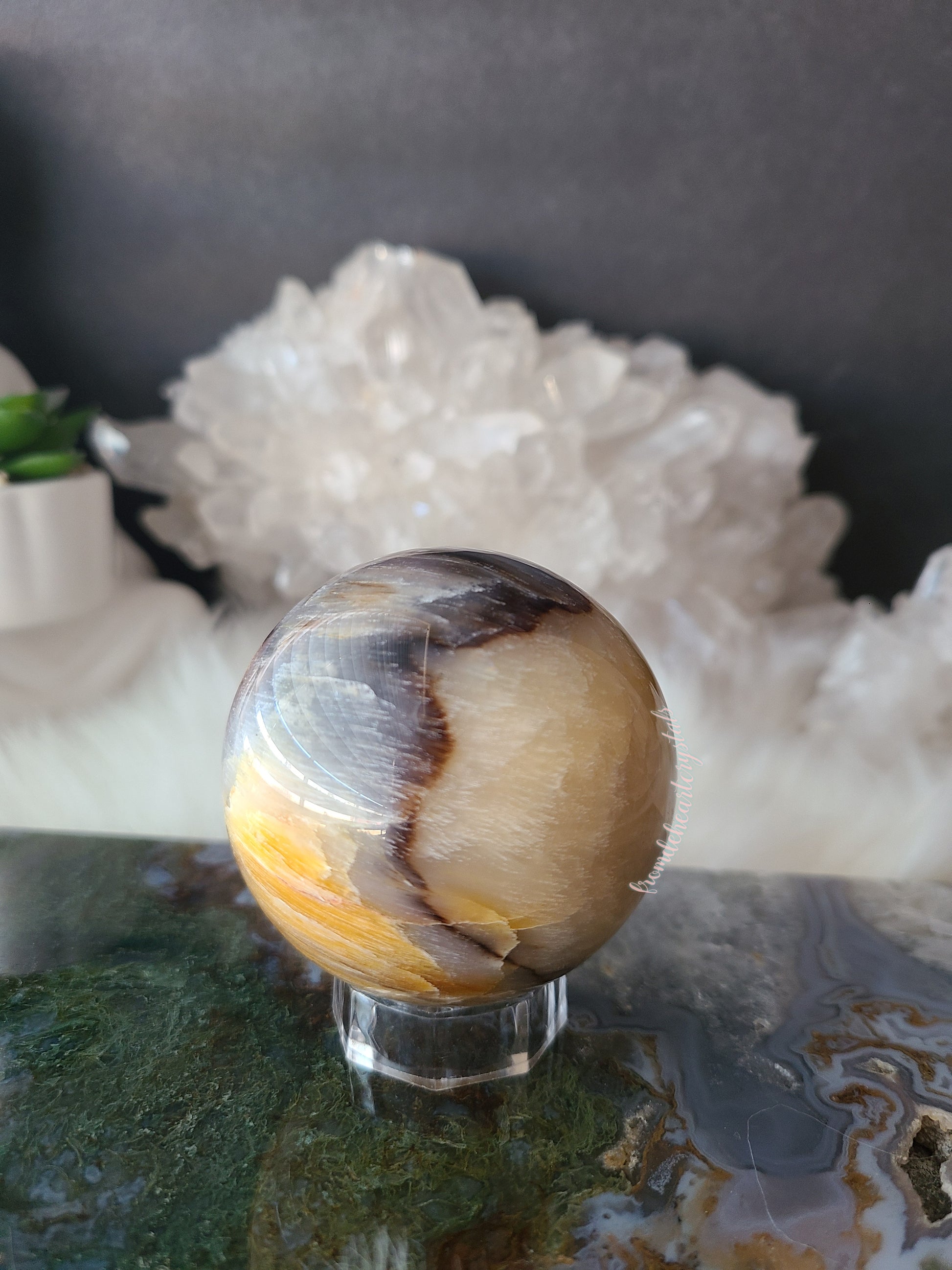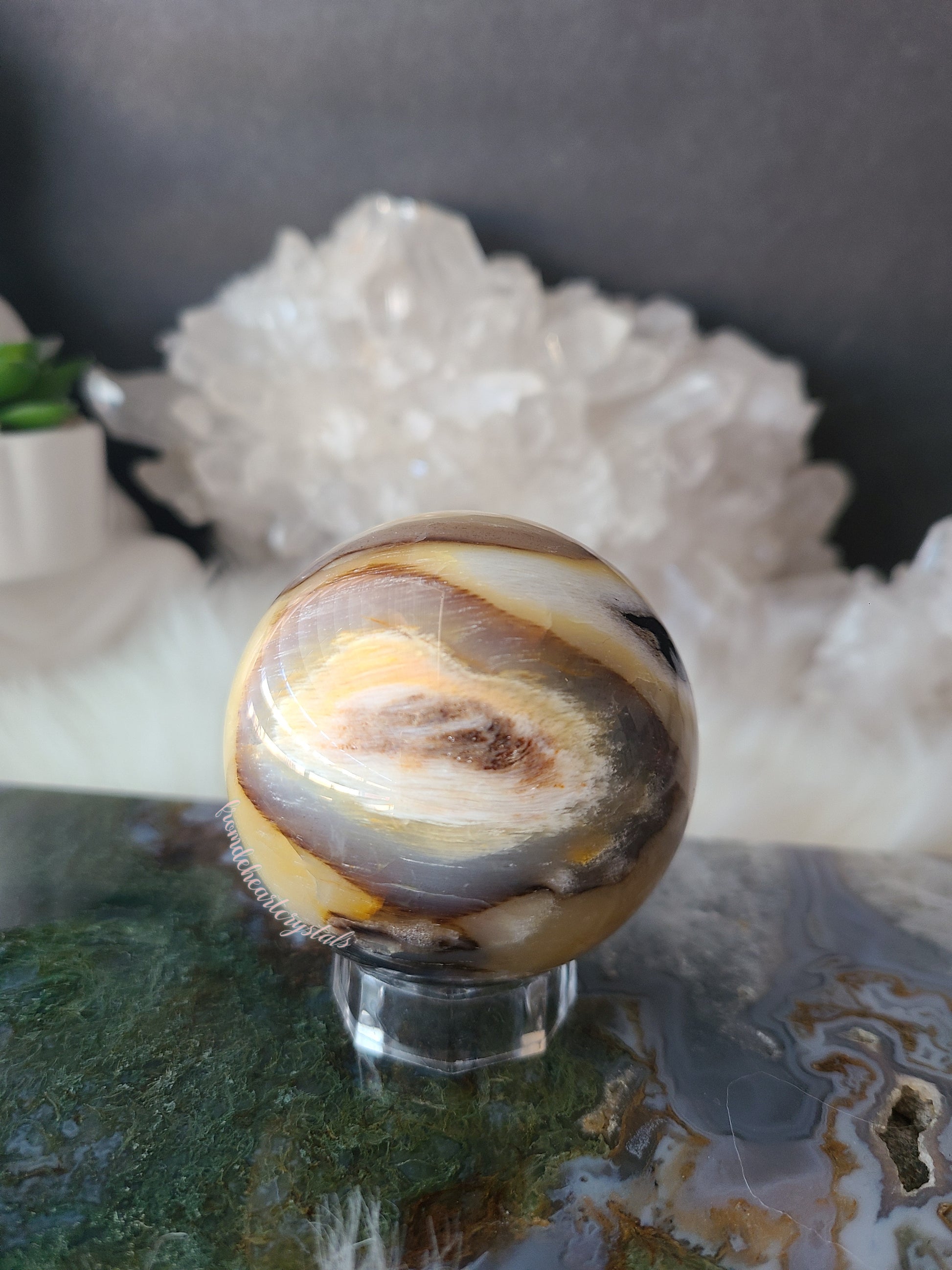 This one-of-a-kind petrified wood sphere is anything but ordinary! Swirled with warm golden brown, creamy white, jet black, and soft beige. This sphere will spruce up your desk, shelf, or living room. This naturally elegant sphere weighs over half of a pound.