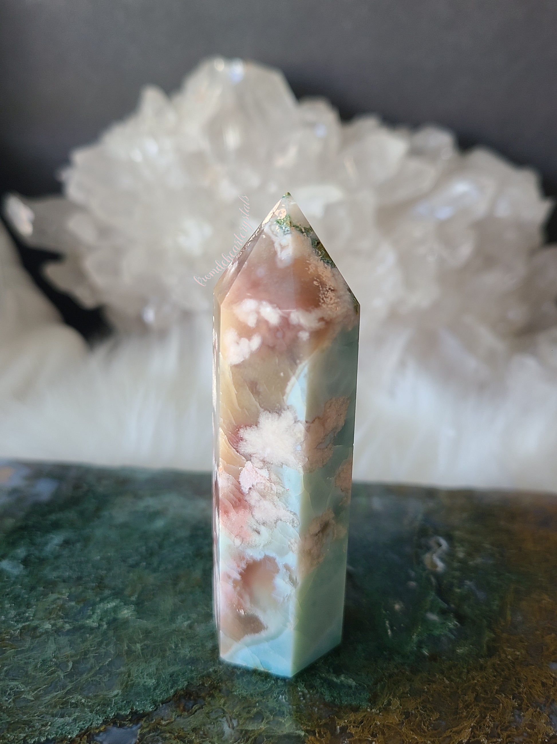 - Rare Pink and Blue tower, with gorgeous hues of pink(s) and a blue (Turquoise) Agate that is reminiscent of Larimar. Stunning colorful combination.