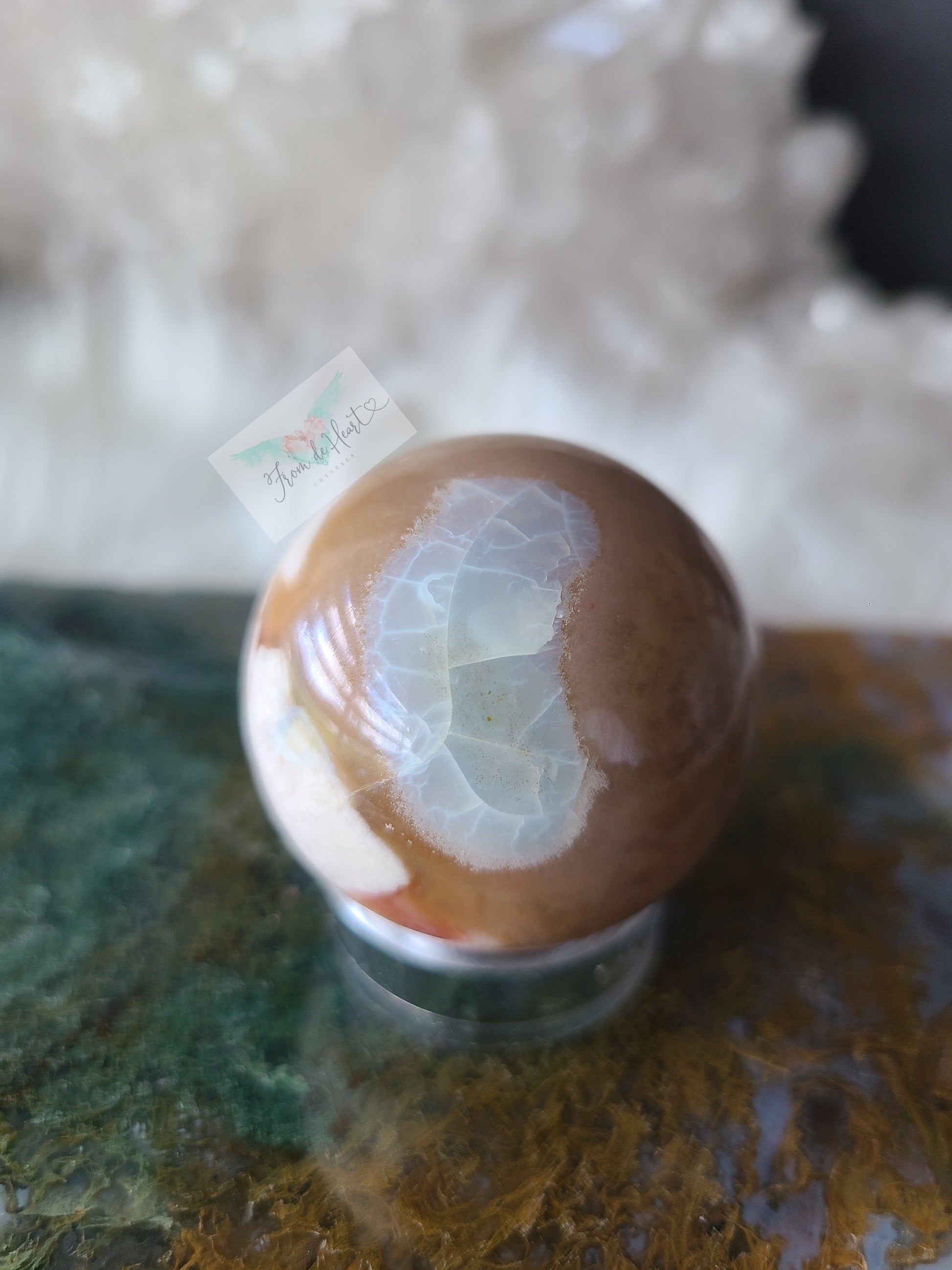 - Small sphere with a big beautiful flower, and a transparent agate pool rimmed in light blue. This colorful sphere also has hues of blue, brown, pink/deep brownish red.