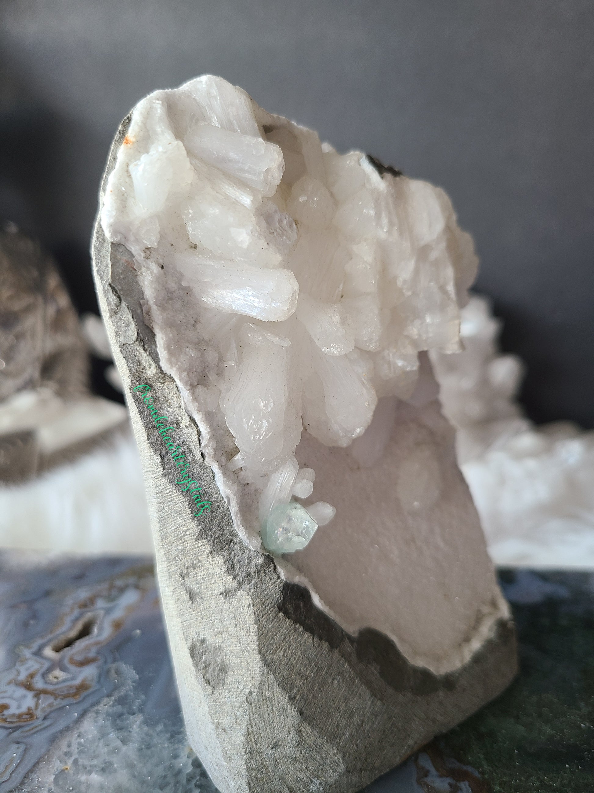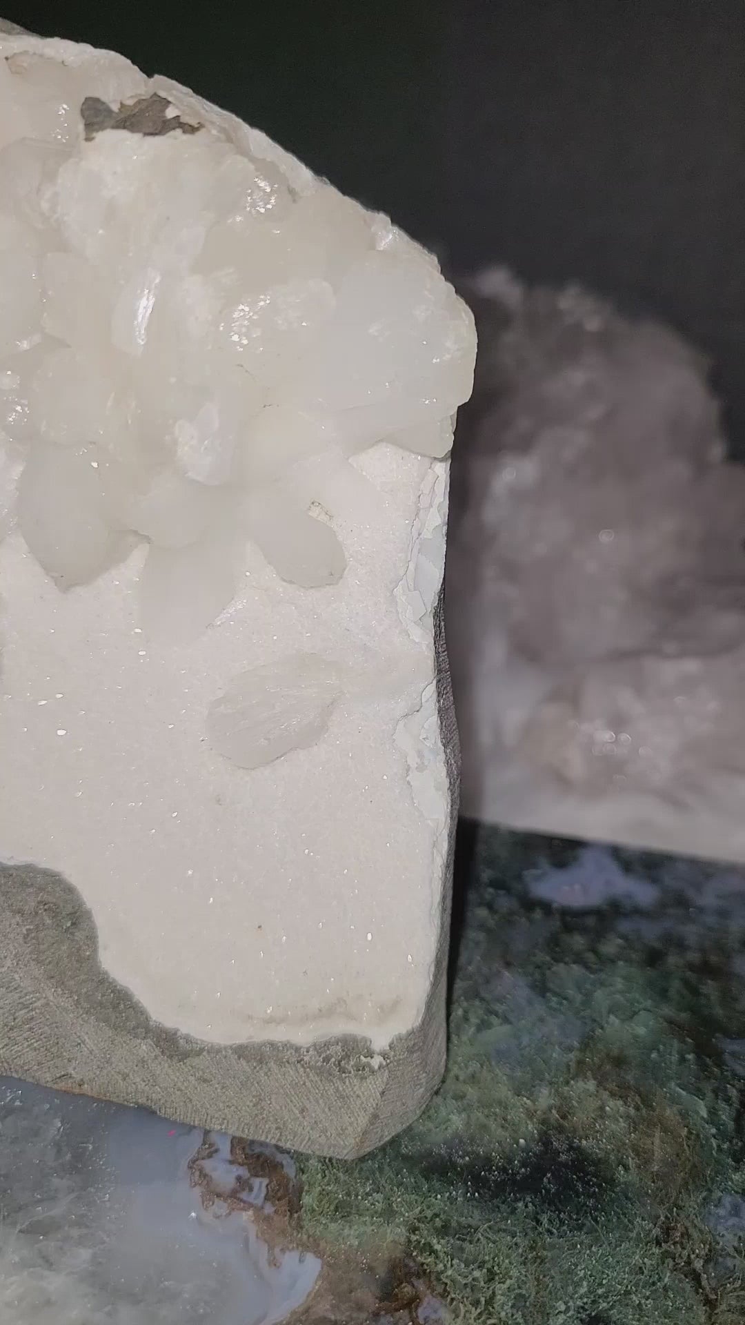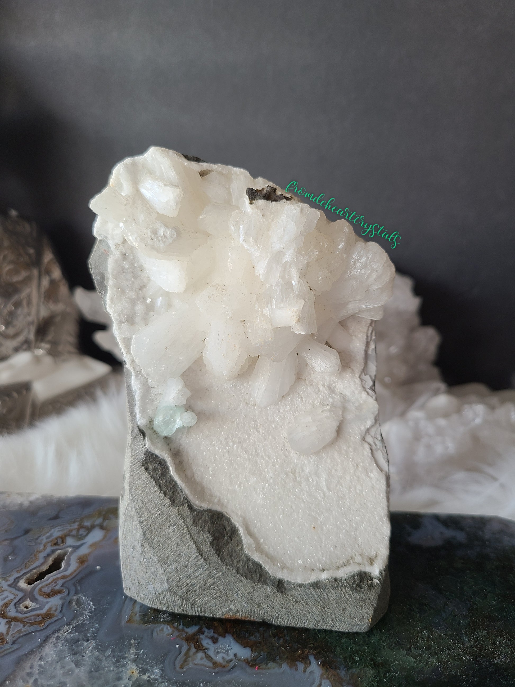 Snow White Stilbite and Green Apophyllite on Sugary Chalcedony Cut base