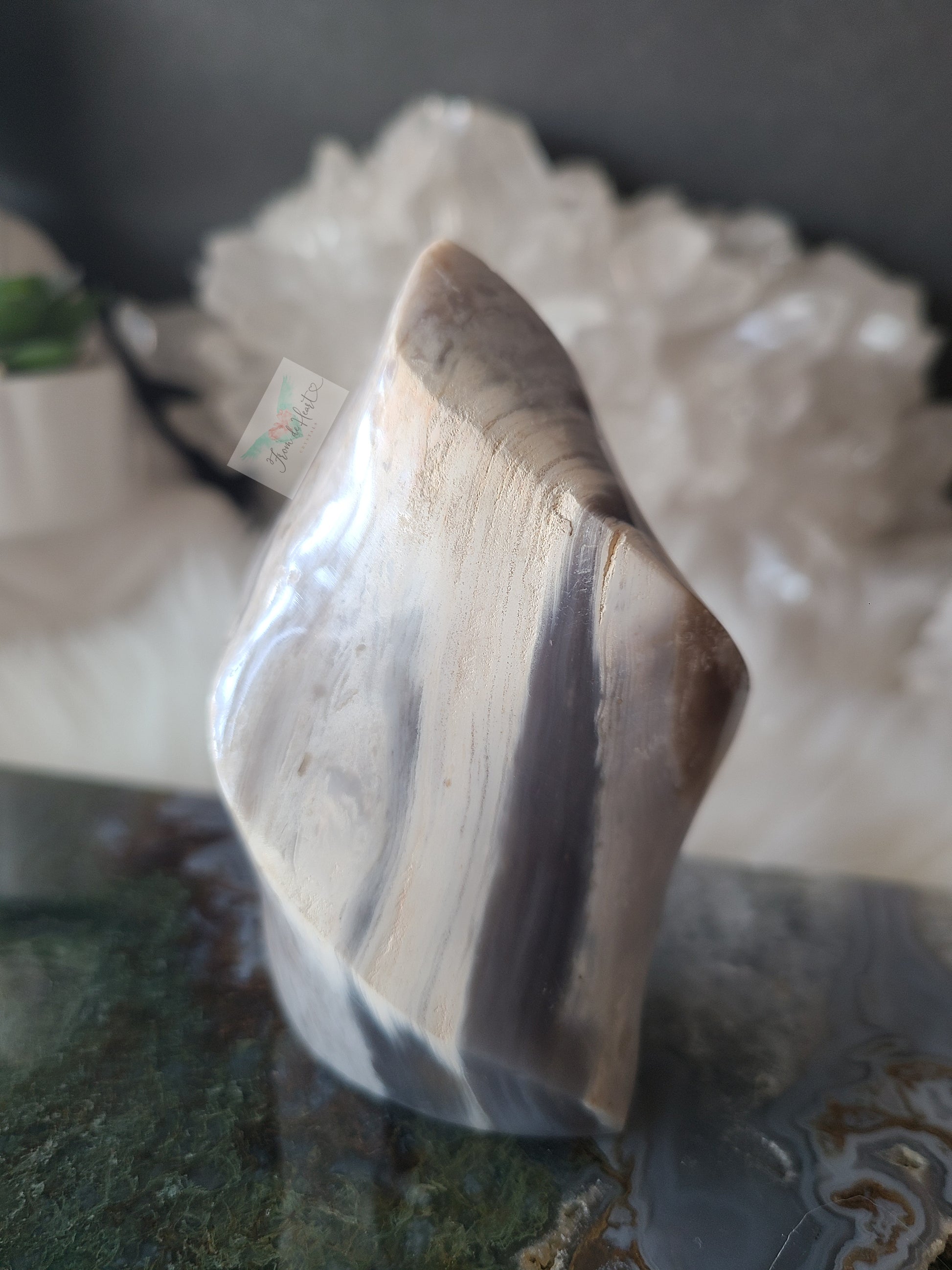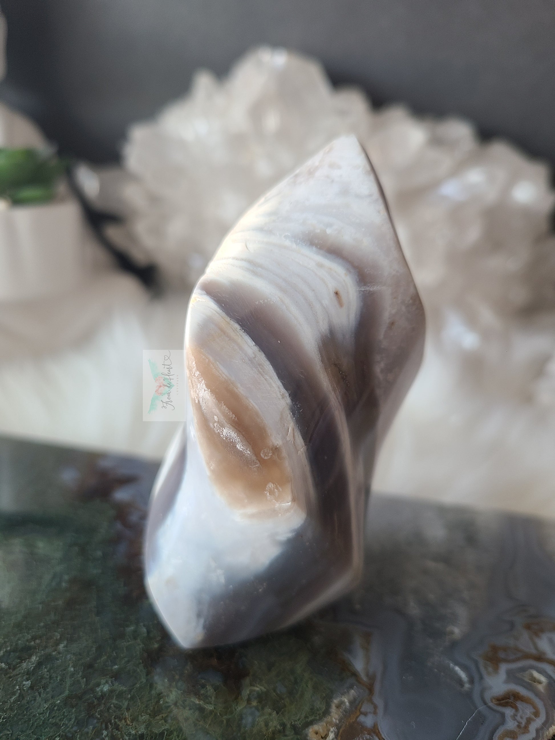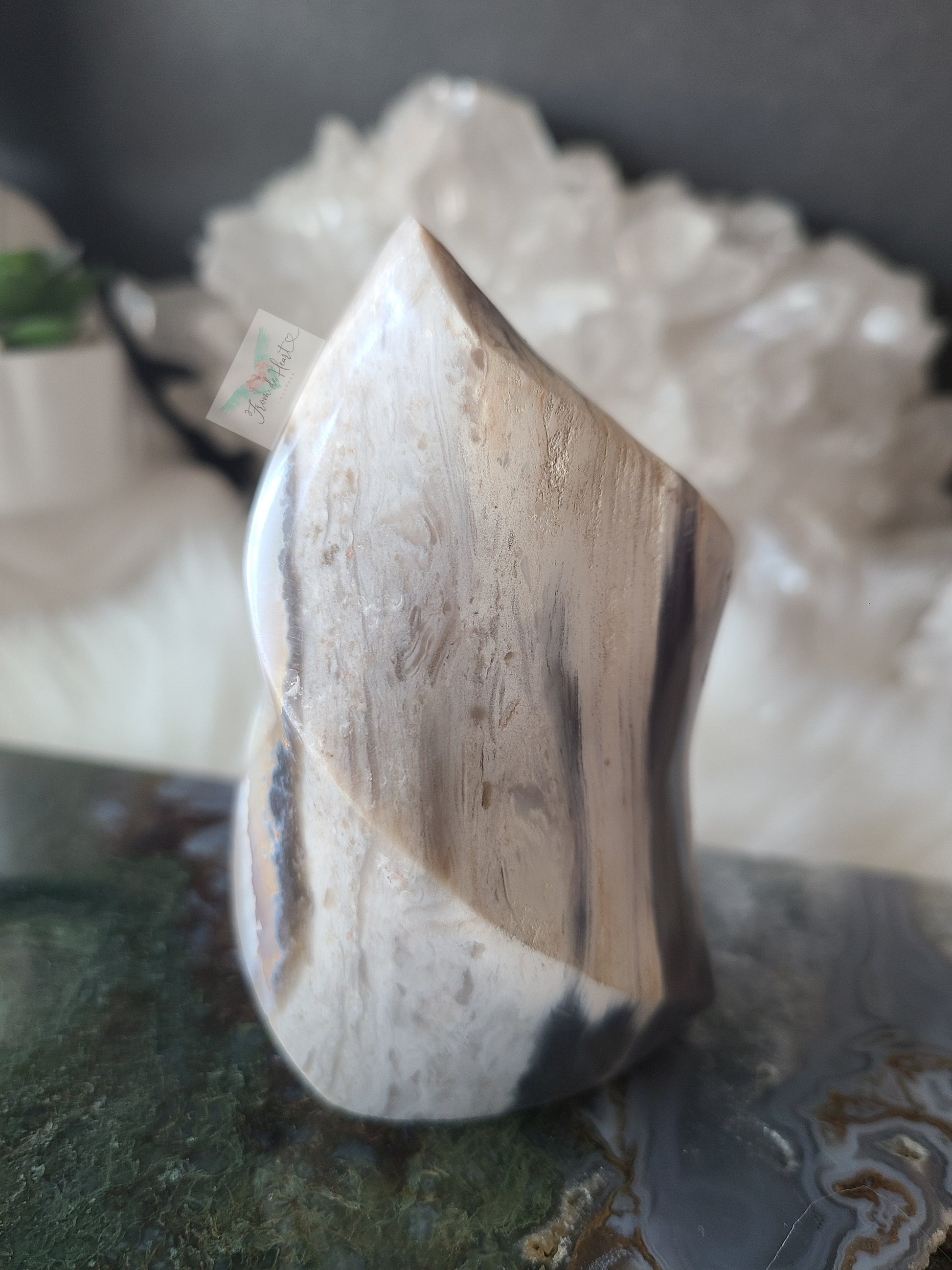 This listing is for (1) Ocean Jasper flame. Fall in love with the understated beauty of this white banded Ocean Jasper flame. It has wonderful earthy tones of brown, blue-gray, and white. It is perfect office or living space decor.